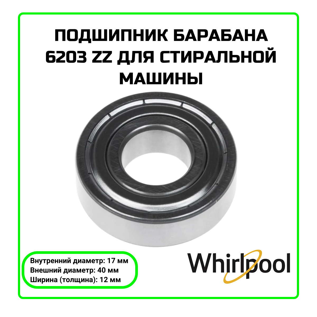 Подшипник барабана 6203 ZZ для стиральной машины Whirlpool (Вирпул) 17х40х12 мм - 13AG013 информация: