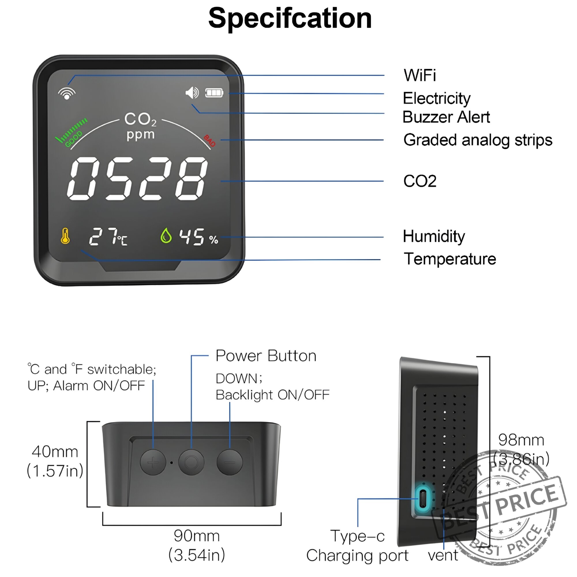 10 цен на Умный Wi-Fi датчик CO² с монитором температуры и влажности воздуха от Tuya Moes