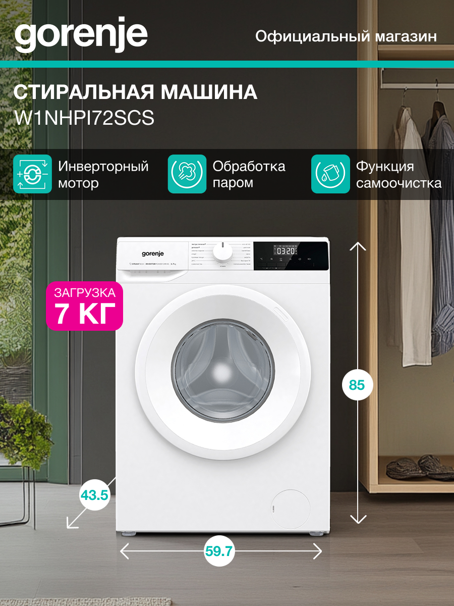 10 цен на Узкая стиральная машина Gorenje W1NHPI72SCS, класс А, 7 кг, 1200 об/мин, Инверторный мотор, самоочистка, белая