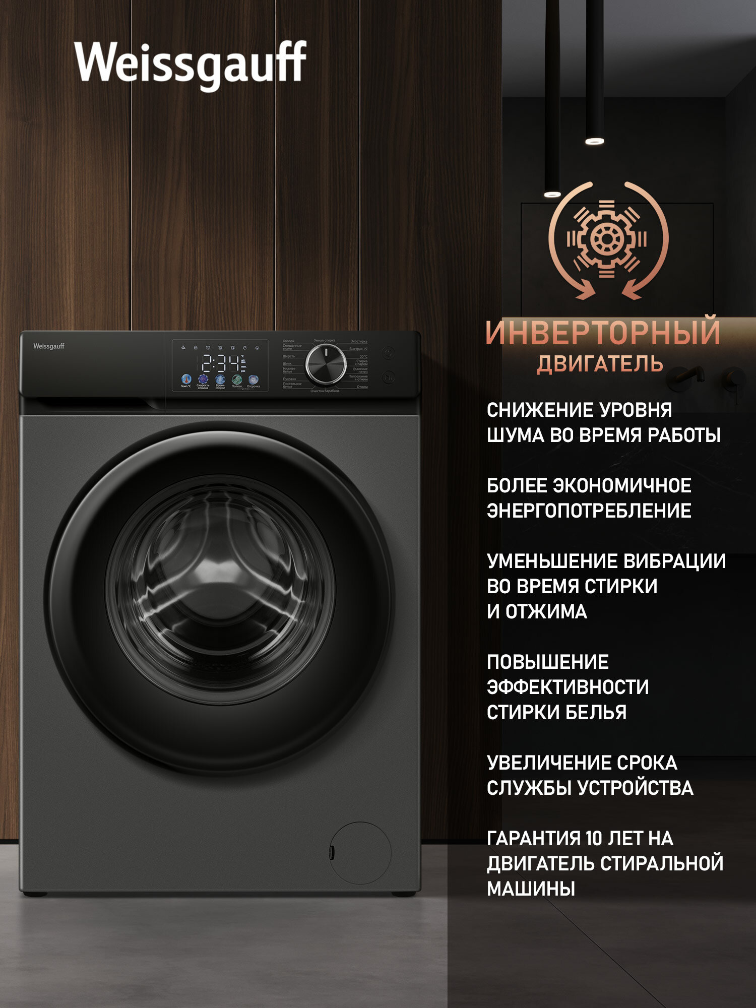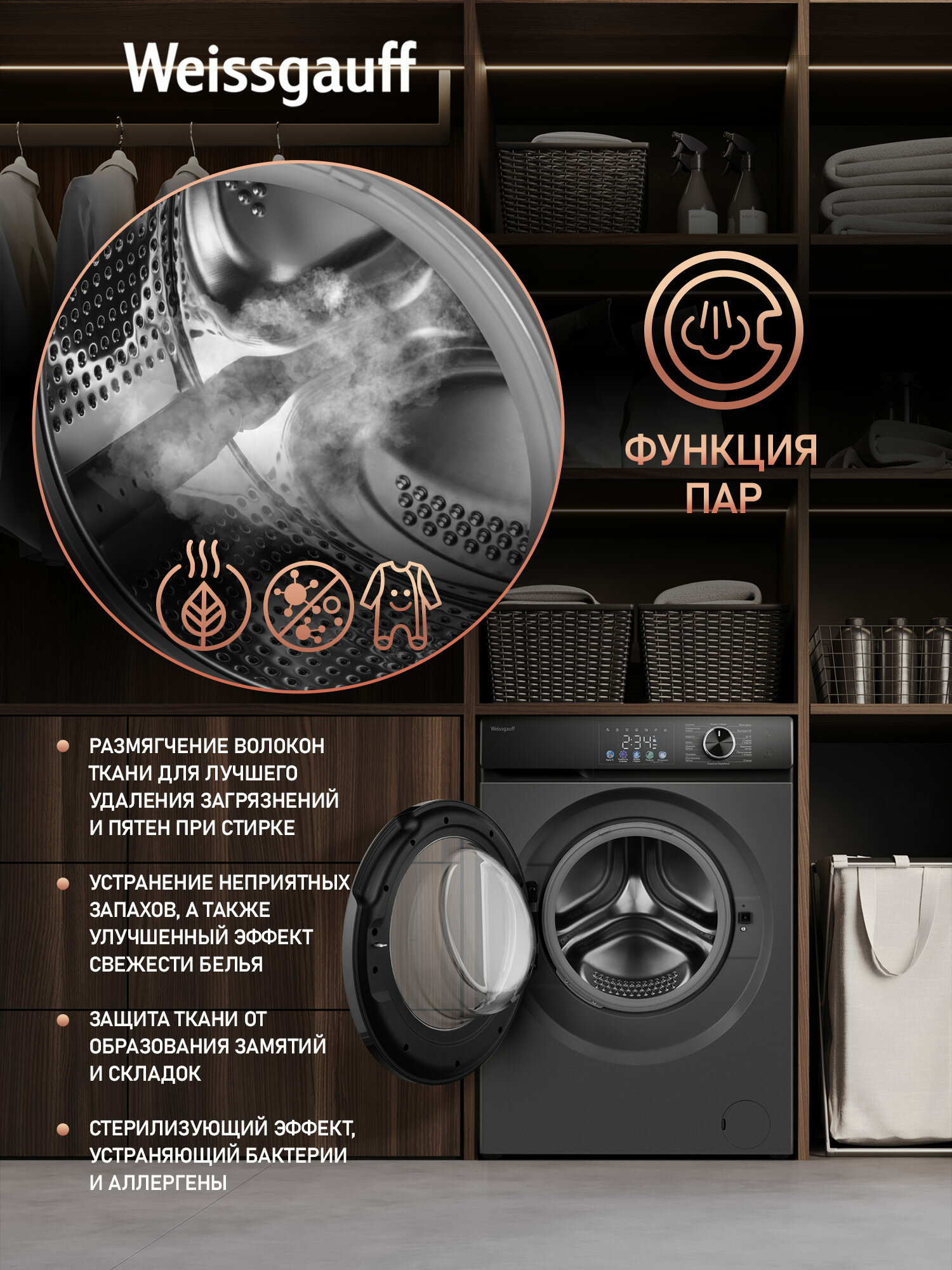 Cтиральная машина с инвертором и паром Weissgauff WM 45126 Inverter Steam Color Touch Grey информация: