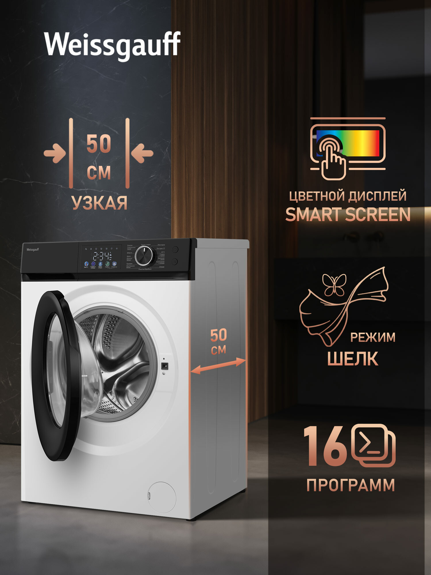Cтиральная машина с инвертором и паром Weissgauff WM 45128 Inverter Steam Color Touch информация: