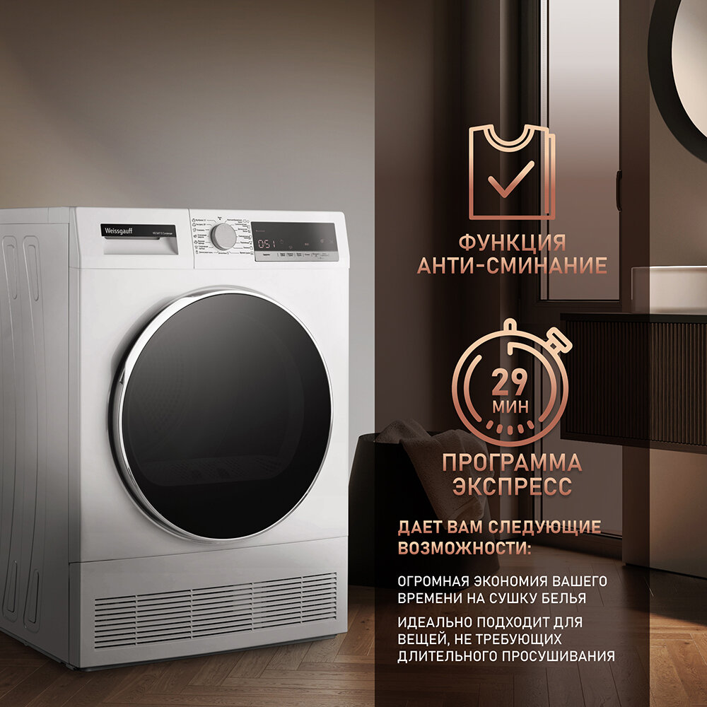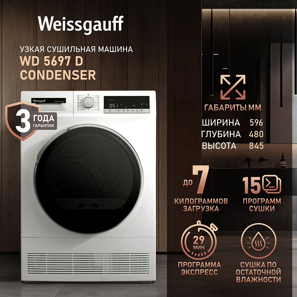 10 цен на Сушильная машина Weissgauff WD 5697 D Condenser, 15 программ, Подсветка барабана, Возможность установки в колонну.