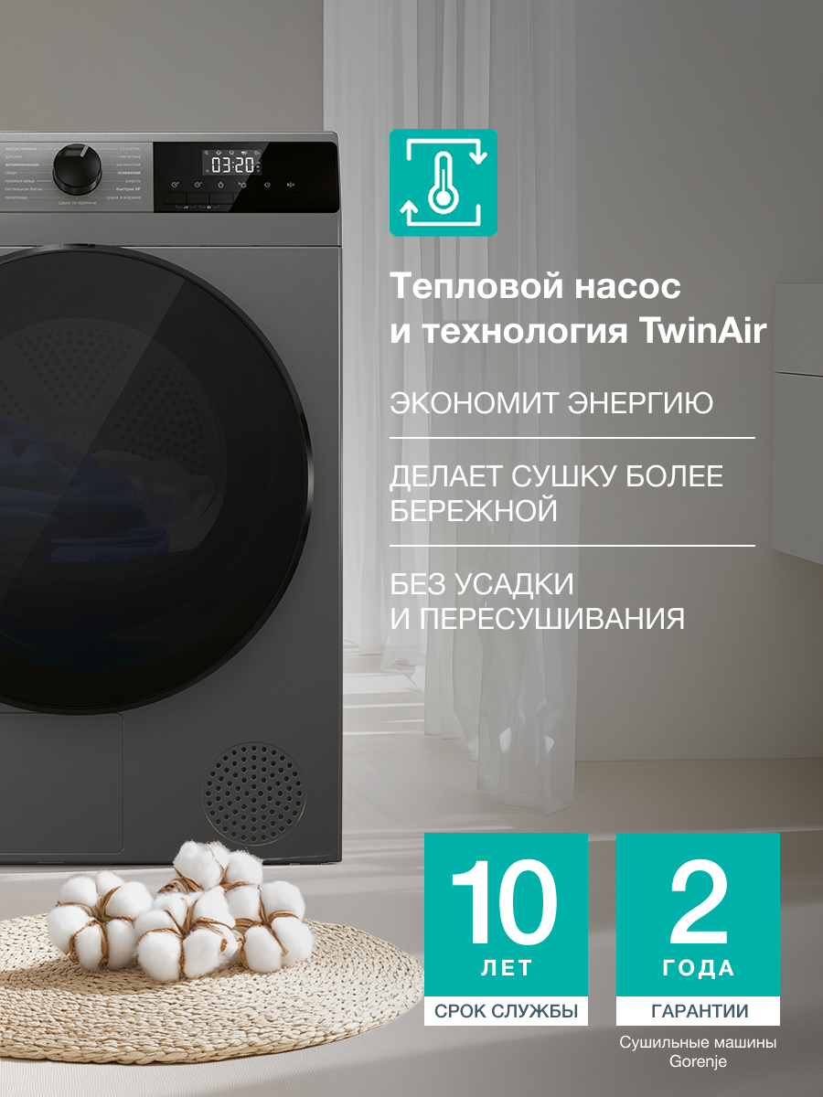 10 цен на Конденсационная сушильная машина с тепловым насосом Gorenje D2HNA92/C, A++, 9 кг, 15 программ, серебрянная