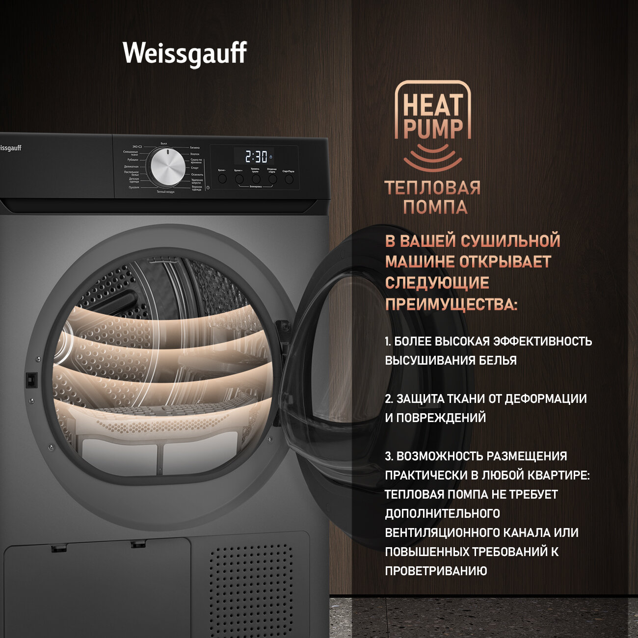 10 цен на Сушильная машина Weissgauff WD 6010 Heat Pump Deep Grey, Тепловая помпа, Загрузка 10 кг