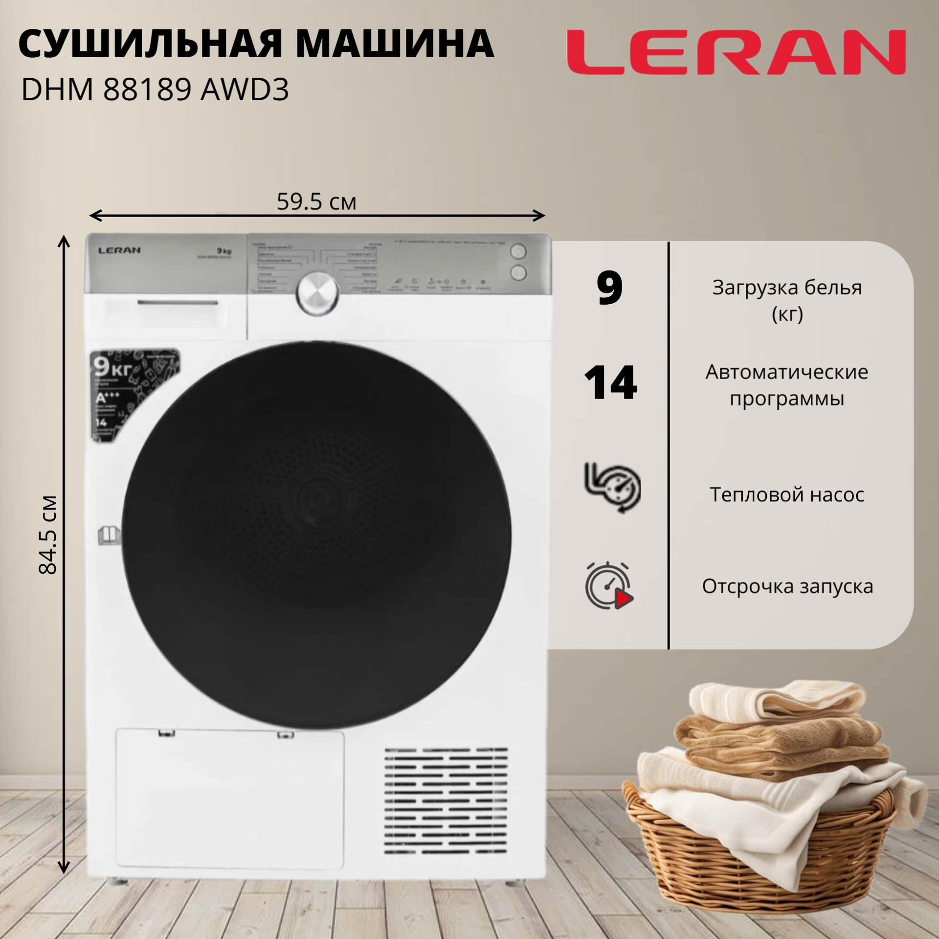 Отзывы на Сушильная машина для белья LERAN DHM 88189 AWD3, загрузка 9 кг, А+++, с тепловым насосом, белый