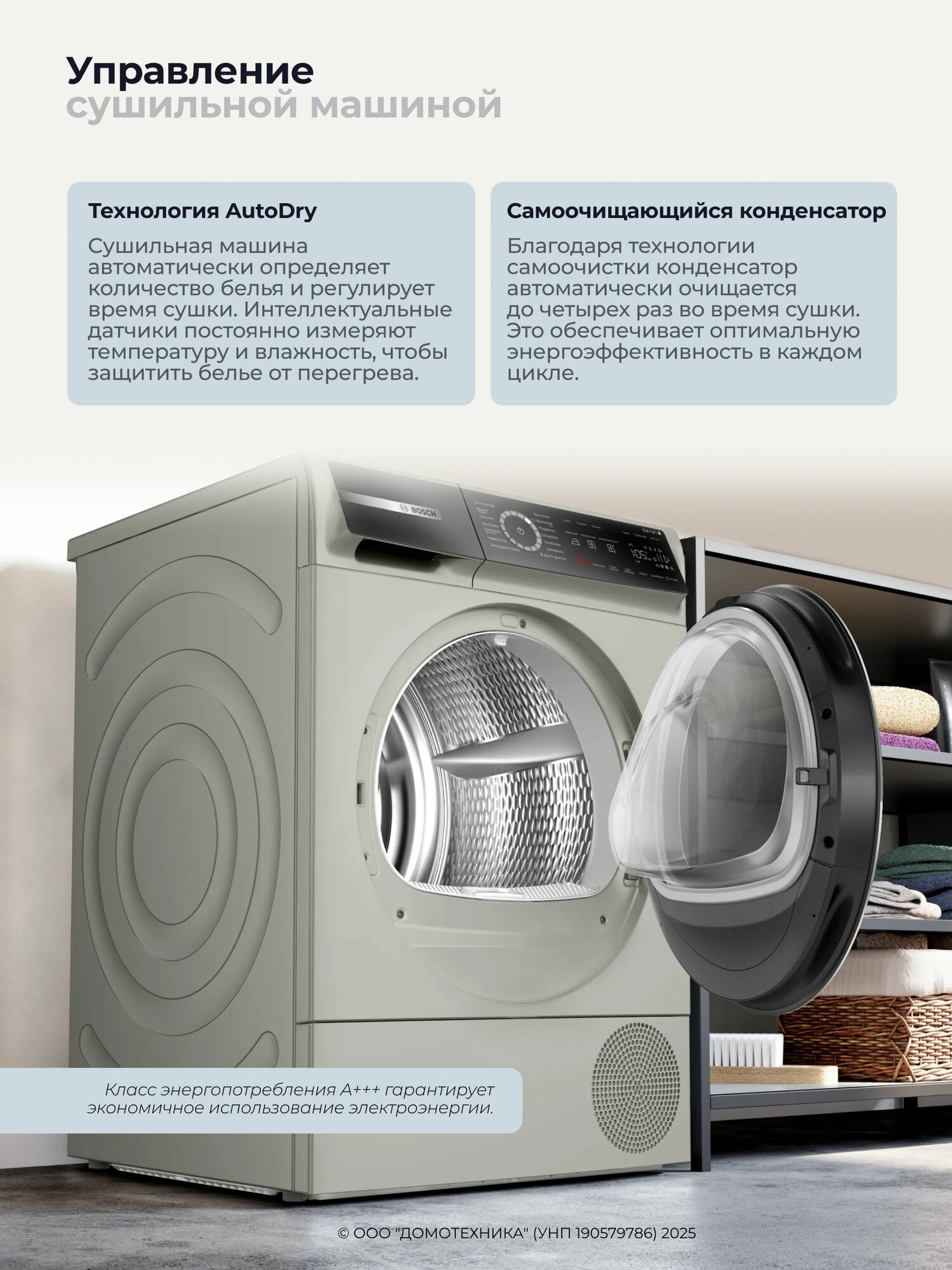 Сушильная машина BOSCH WQB246CX0, Serie 8, 9 кг, тепловой насос, самоочищающийся конденсатор, Auto Dry информация: