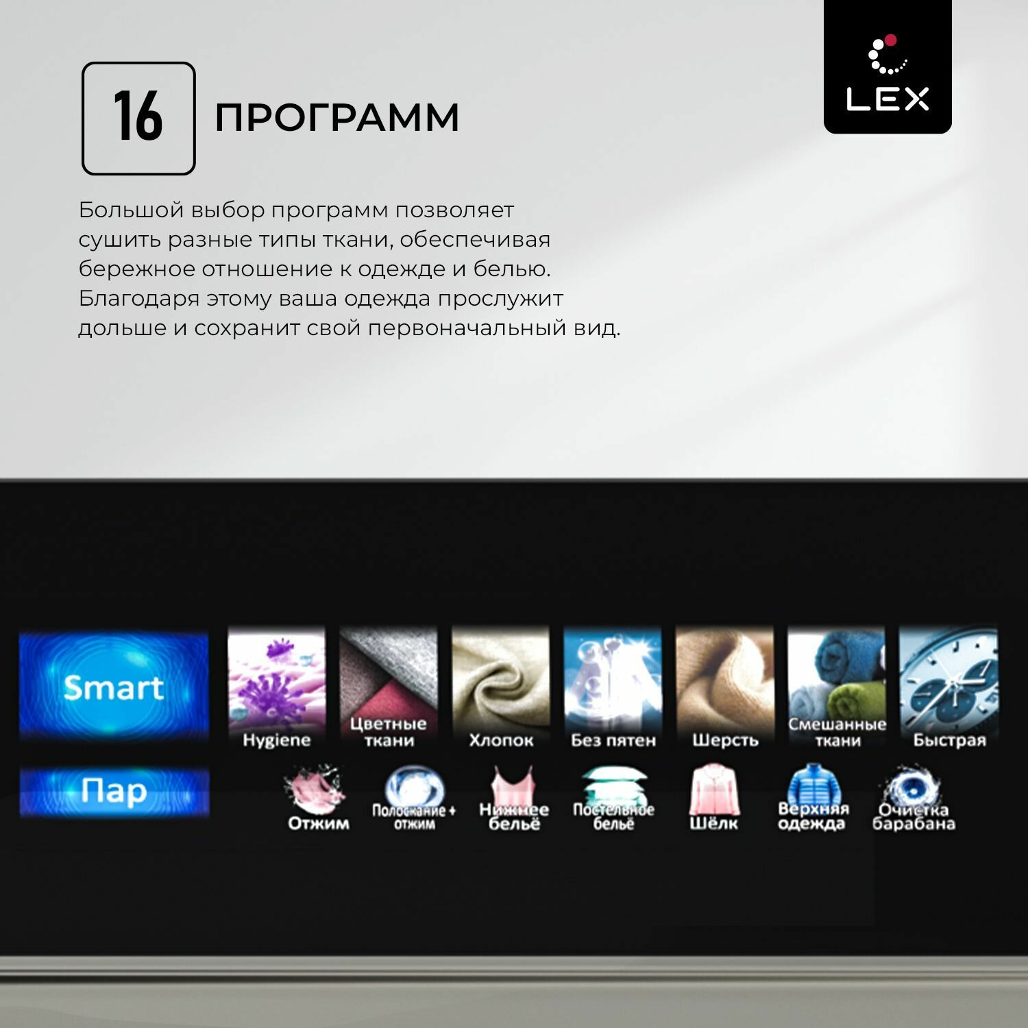 Сушильная машина Lex LDM12GrBlThD, серый, 10 кг, 16 программ, класс A++, таймер, дозагрузка белья, цветной дисплей информация: