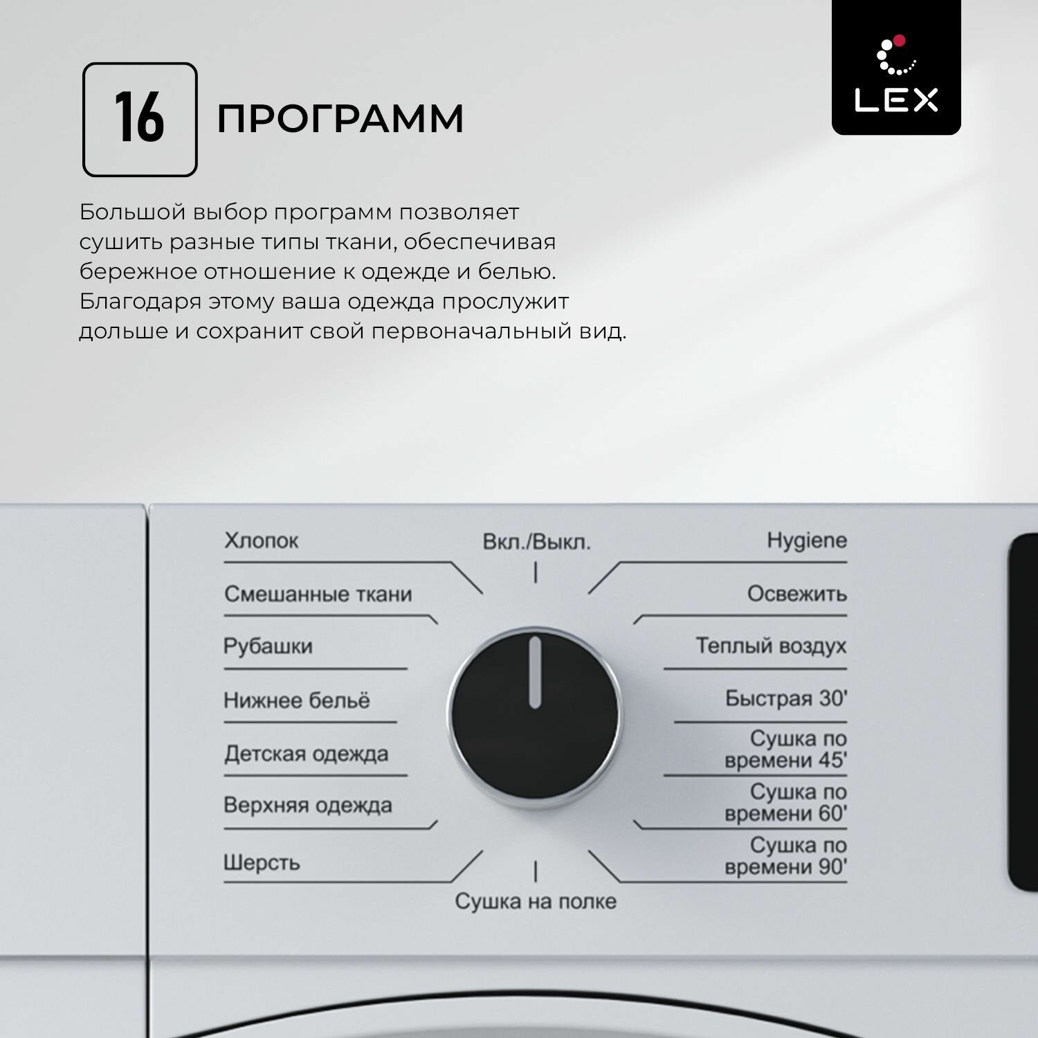 Сушильная машина Lex LDM10WD, белый, 10 кг, 16 программ, класс A++, таймер, дозагрузка белья информация: