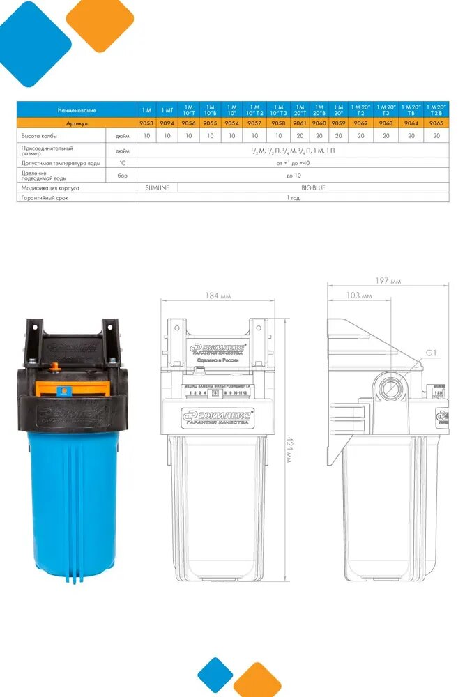 Фильтр Джилекс Big Blue 10" синий, подключение 1", 180 мм, под картридж 114 мм