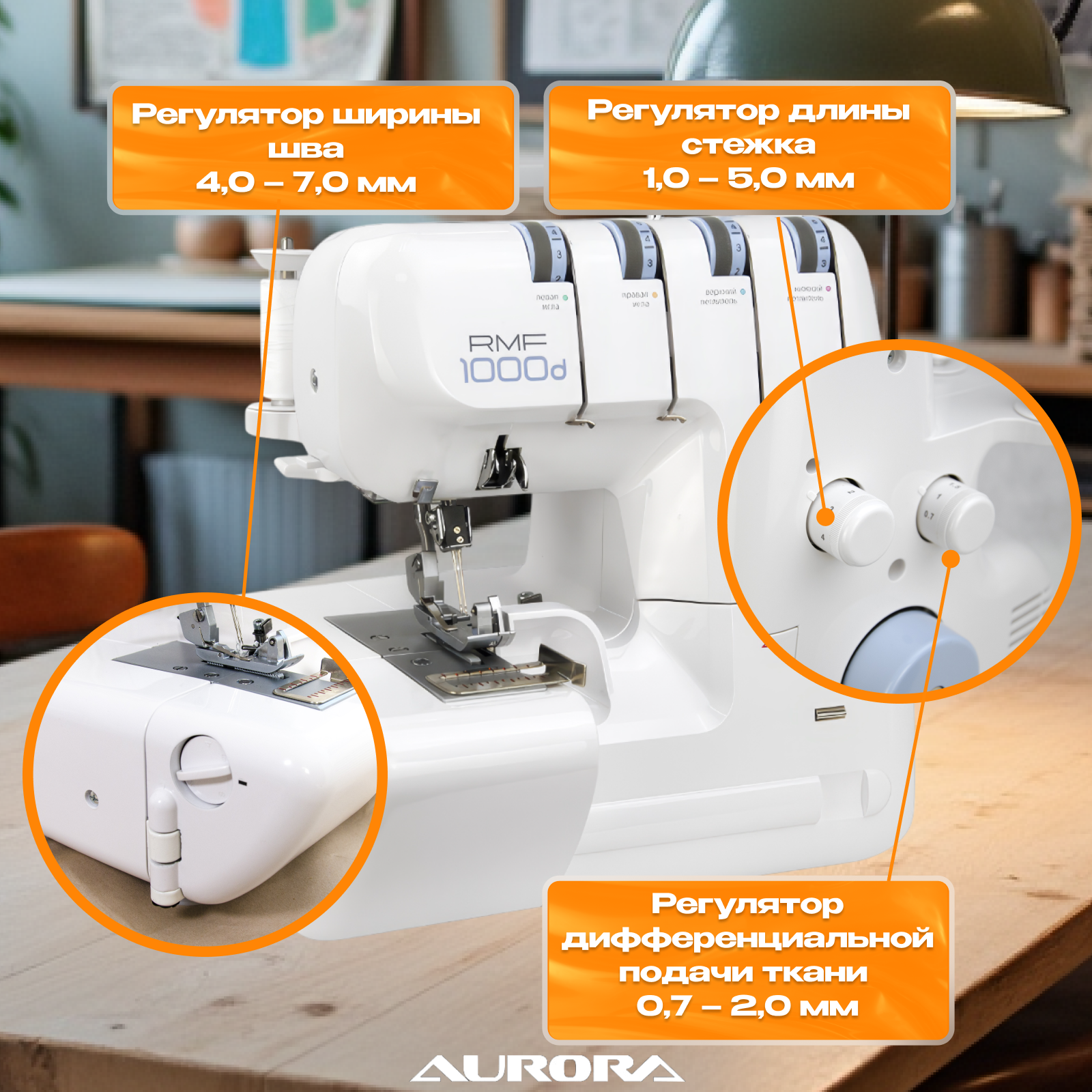 10 цен на Оверлок Aurora "RMF 1000D", 2-3-4 нити, 12 типов швов, скорость 1300 ст/мин, белый. 3 лапки в комплекте