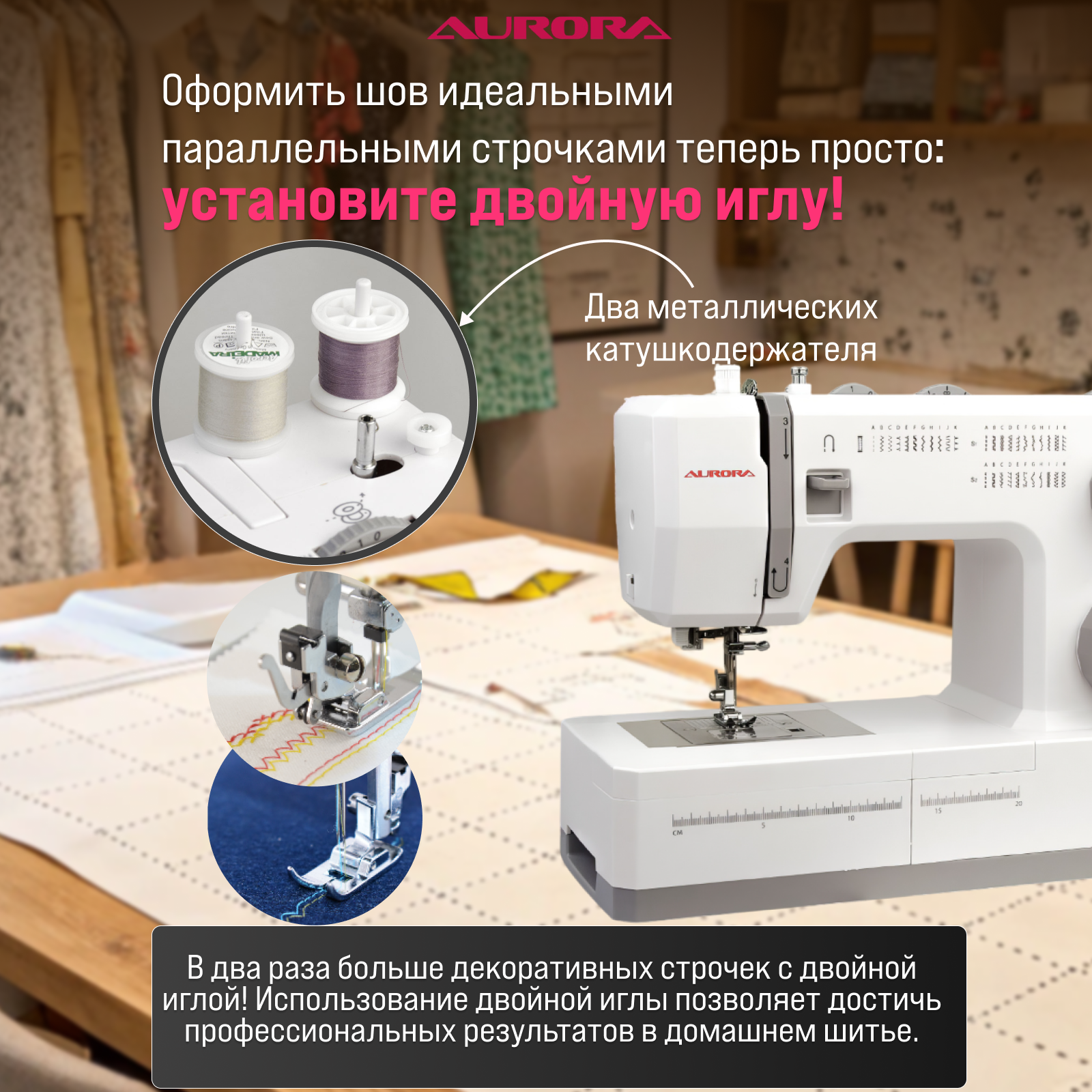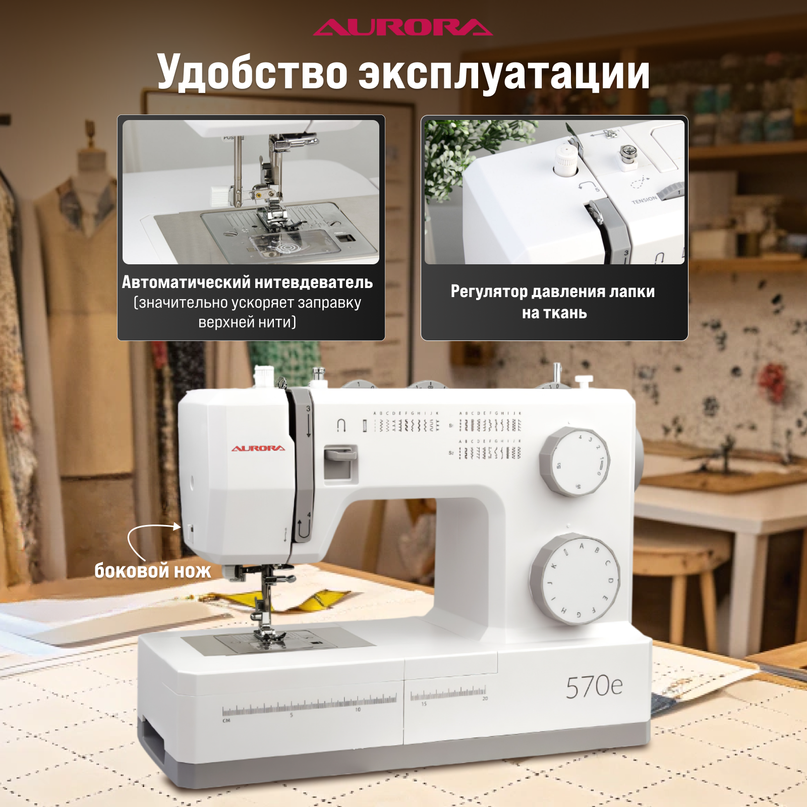Швейная машинка AURORA 580e сервомотор 100Вт, кнопка старт/стоп, автоматическая петля, приставной столик