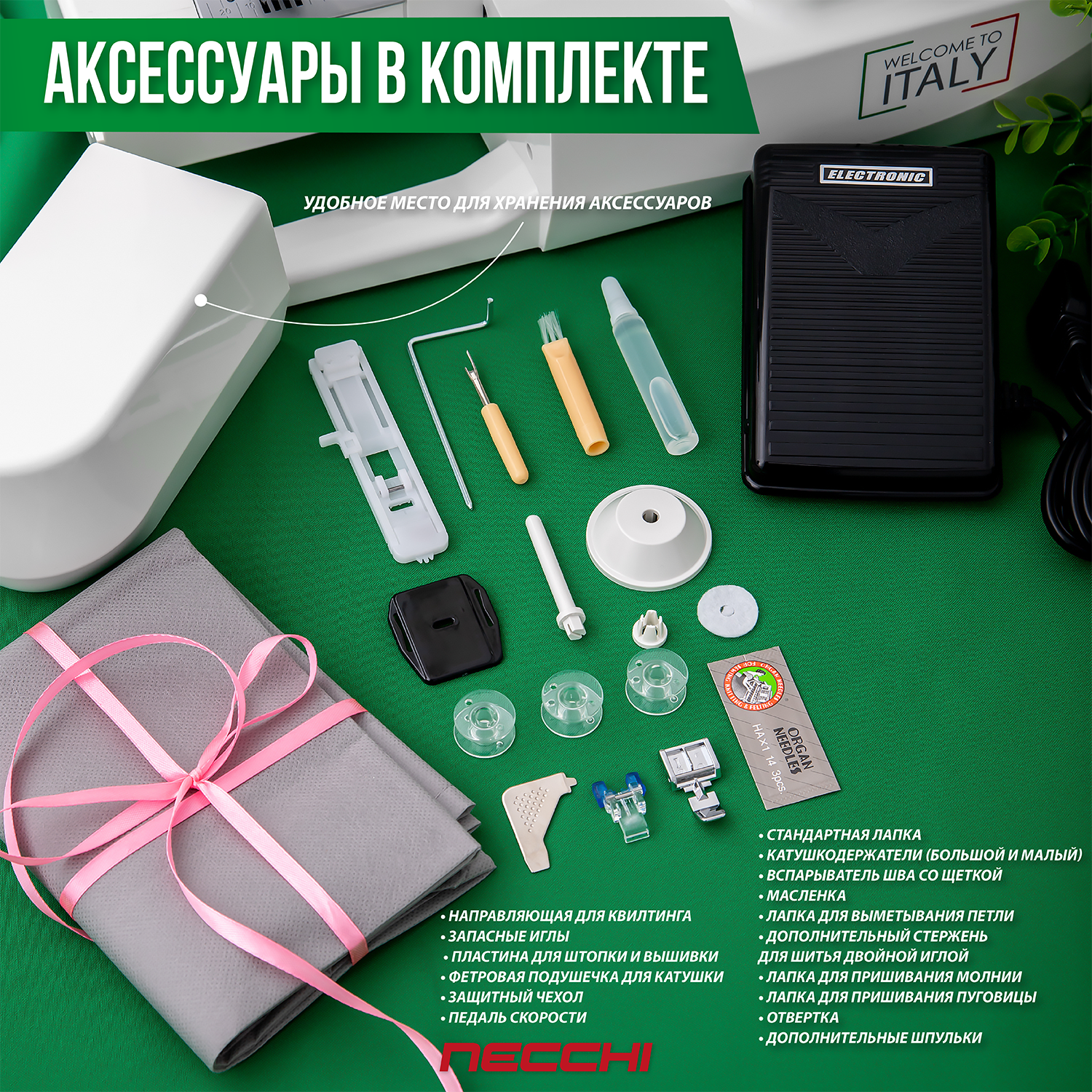 | Подробная комплектация | Мягкий чехол, набор игл, катушкодержатель, распарыватель с кисточкой, лапка для петли автомат , шпульки (3шт.),отверка, лапка для пришивания пуговиц, лапка для вшивания молнии, направляющая для стежки, накладка для отключения зубчатой рейки, масленка, держатель катушки бол. и мал. |