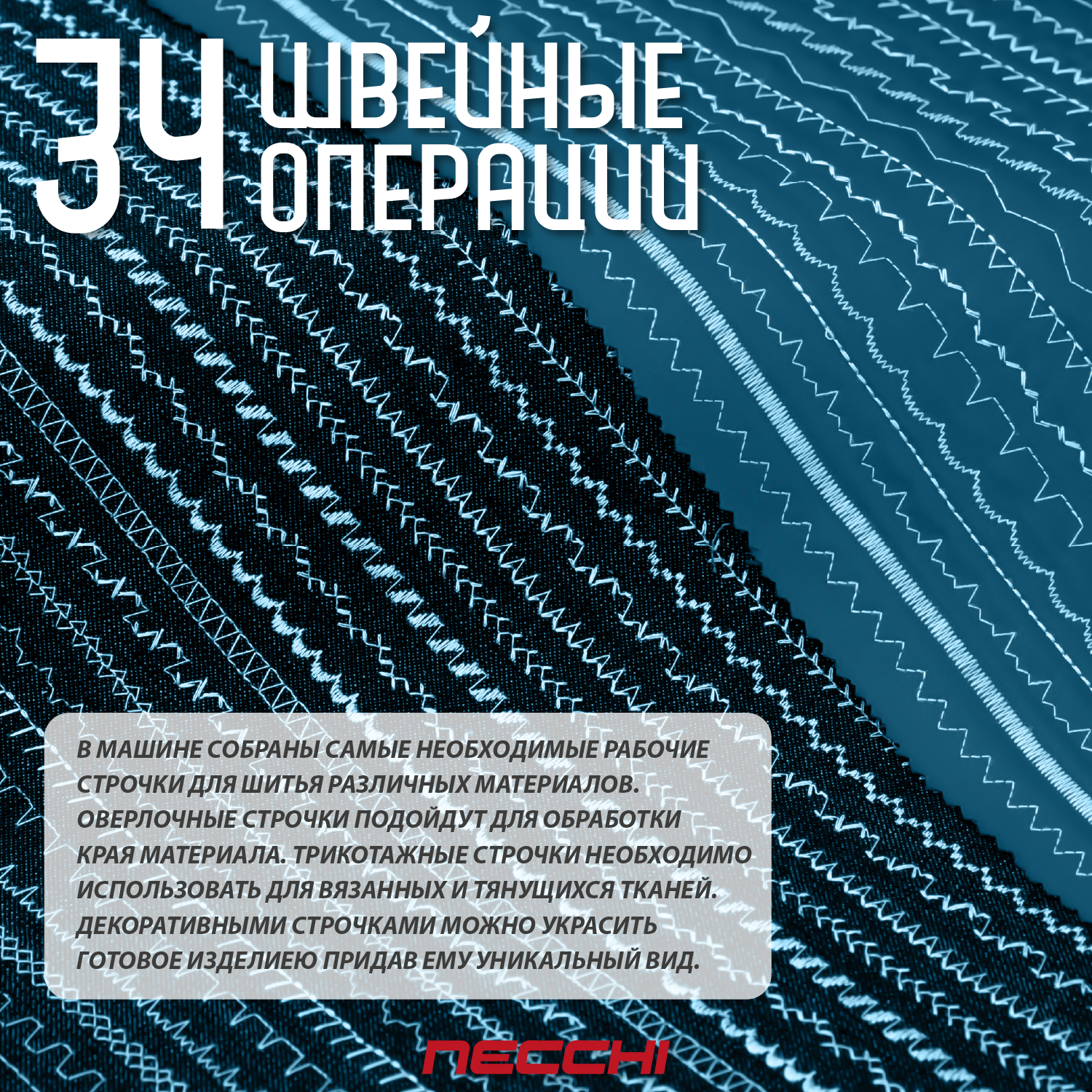 Швейная машина Necchi Q132A, 34 операции, петля автомат, мощный двигатель 90Вт, нитедеватель, доп. столик информация: