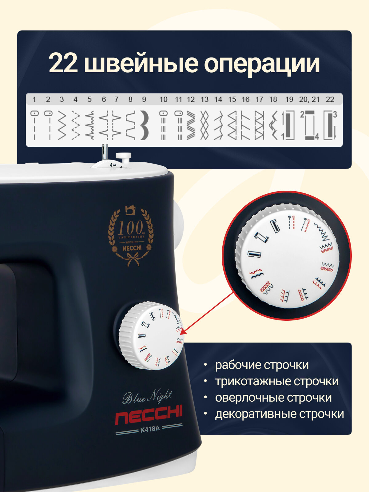 Швейная машина Necchi K418A, 22 операции, петля полуавтомат, вертикальный челнок информация:
