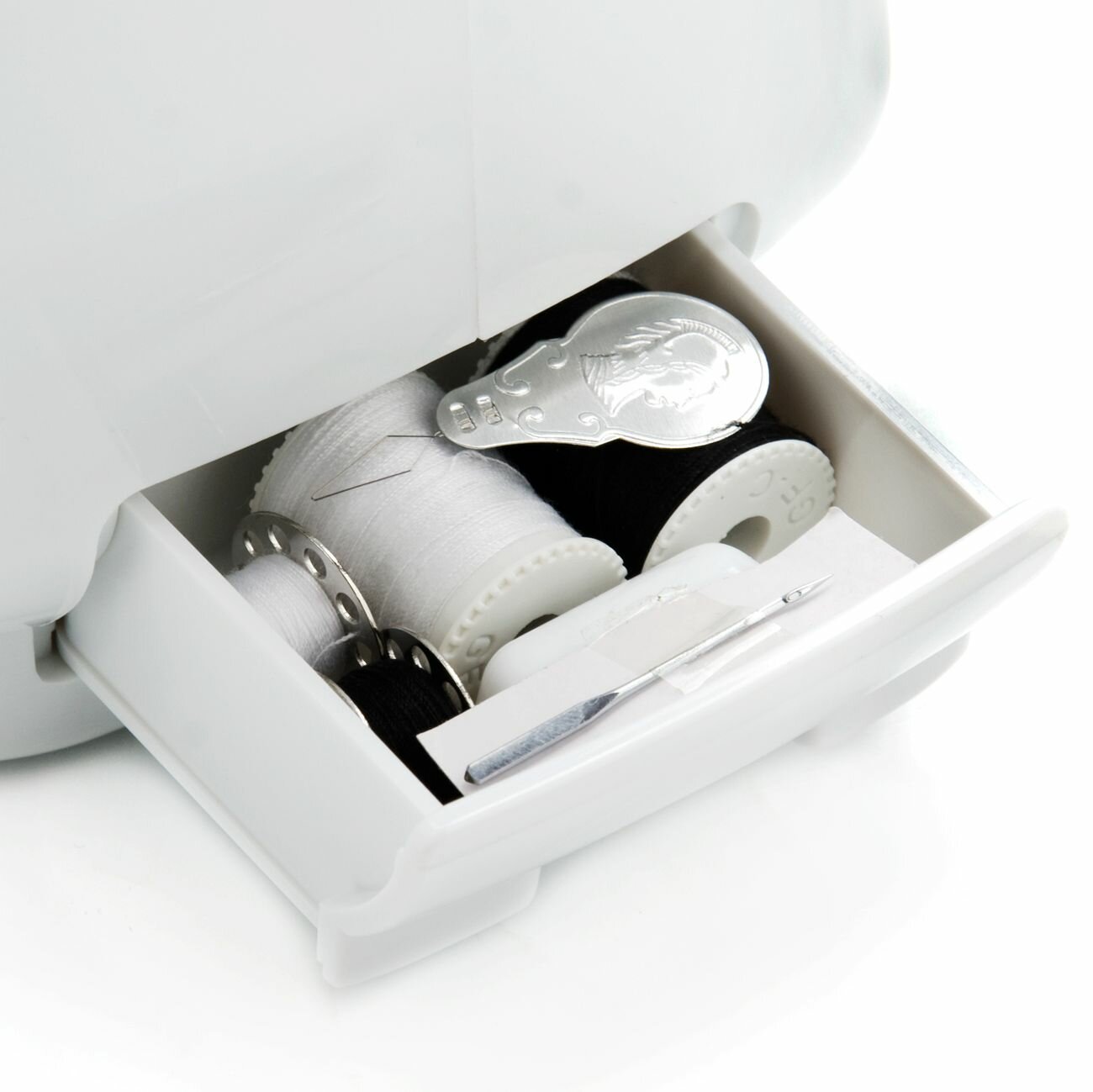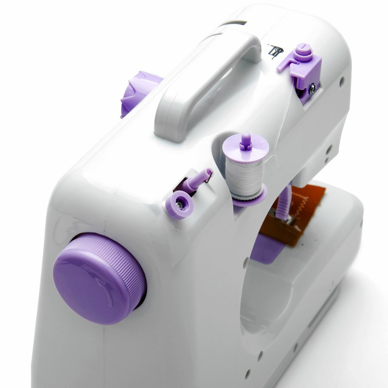 | Дополнительная информация | Материал: ABS-пластик, металл. Цвет: белый, фиолетовый. Питание: сетевой адаптер. Дисплей: нет. Рукавная платформа: есть. Освещение: есть. Отсек для аксессуаров: есть. Регулировка скорости шитья: есть. Кол-во скоростей: 2. Разновидностей строчек: 8. |