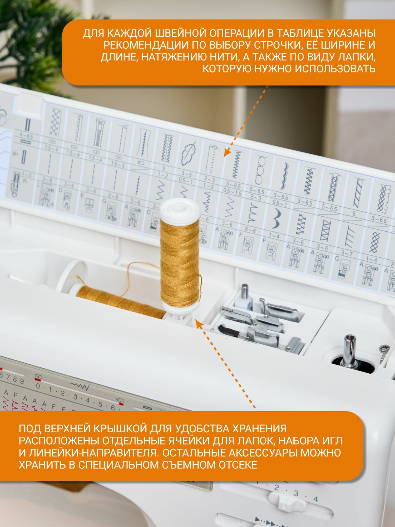 | Вид строчки | Бельевая петля, Декоративная строчка, Декоративная эластичная строчка, Закрытая имитация оверлочной строчки, Зигзаг, Открытая имитация оверлочной строчки, Петля-автомат, Потайная строчка, Прямая строчка, Пуловерная строчка с усиленным краем, Соединительная строчка, Сотовая строчка, Трикотажная строчка, Тройная усиленная прямая строчка, Тройной усиленный зигзаг, Фестонный шов, Эластичная потайная строчка, Эластичный зигзаг |