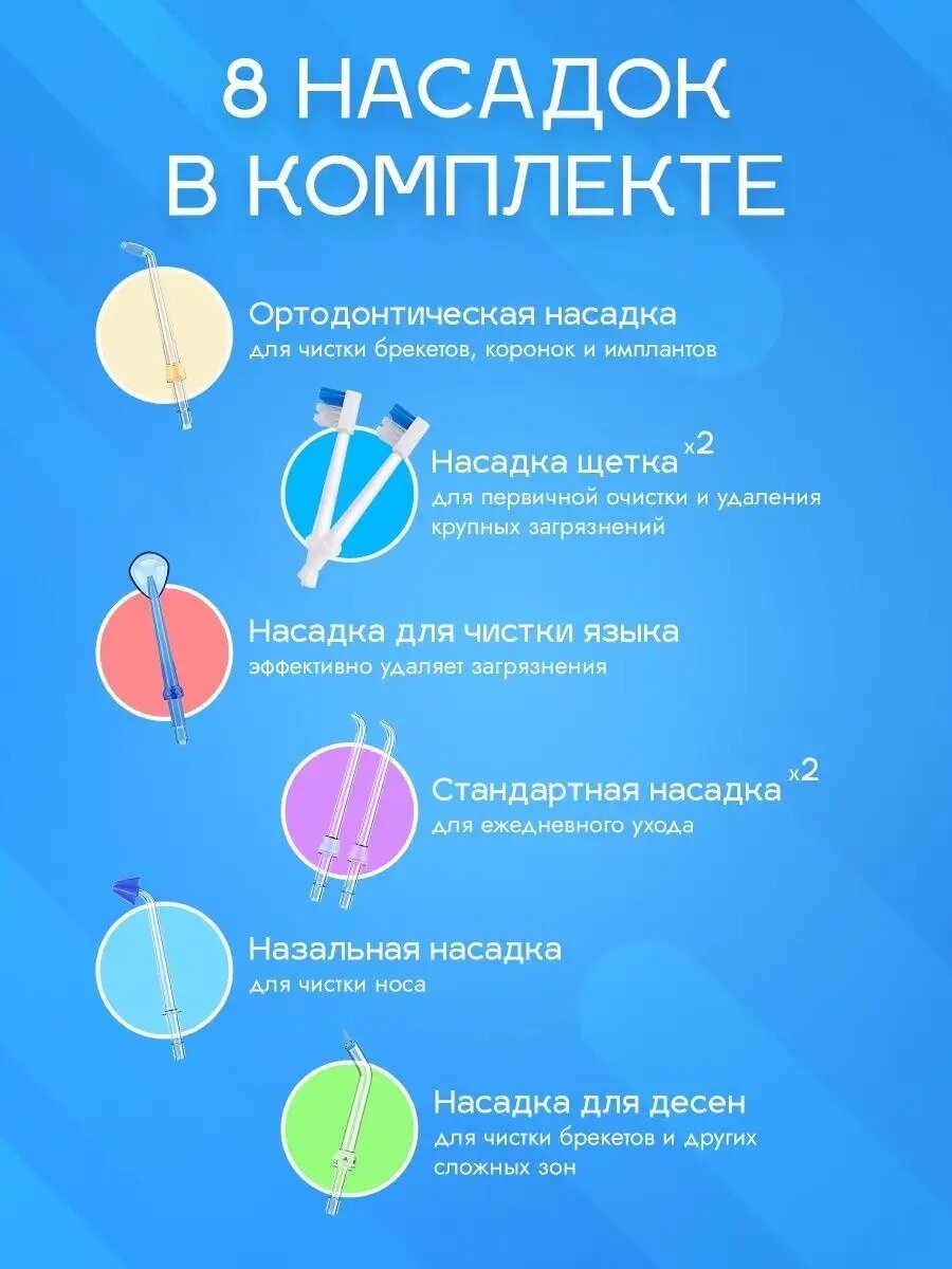 Ирригатор для чистки полости рта и зубов портативный с комплектом насадок и зврядным кабелем USB