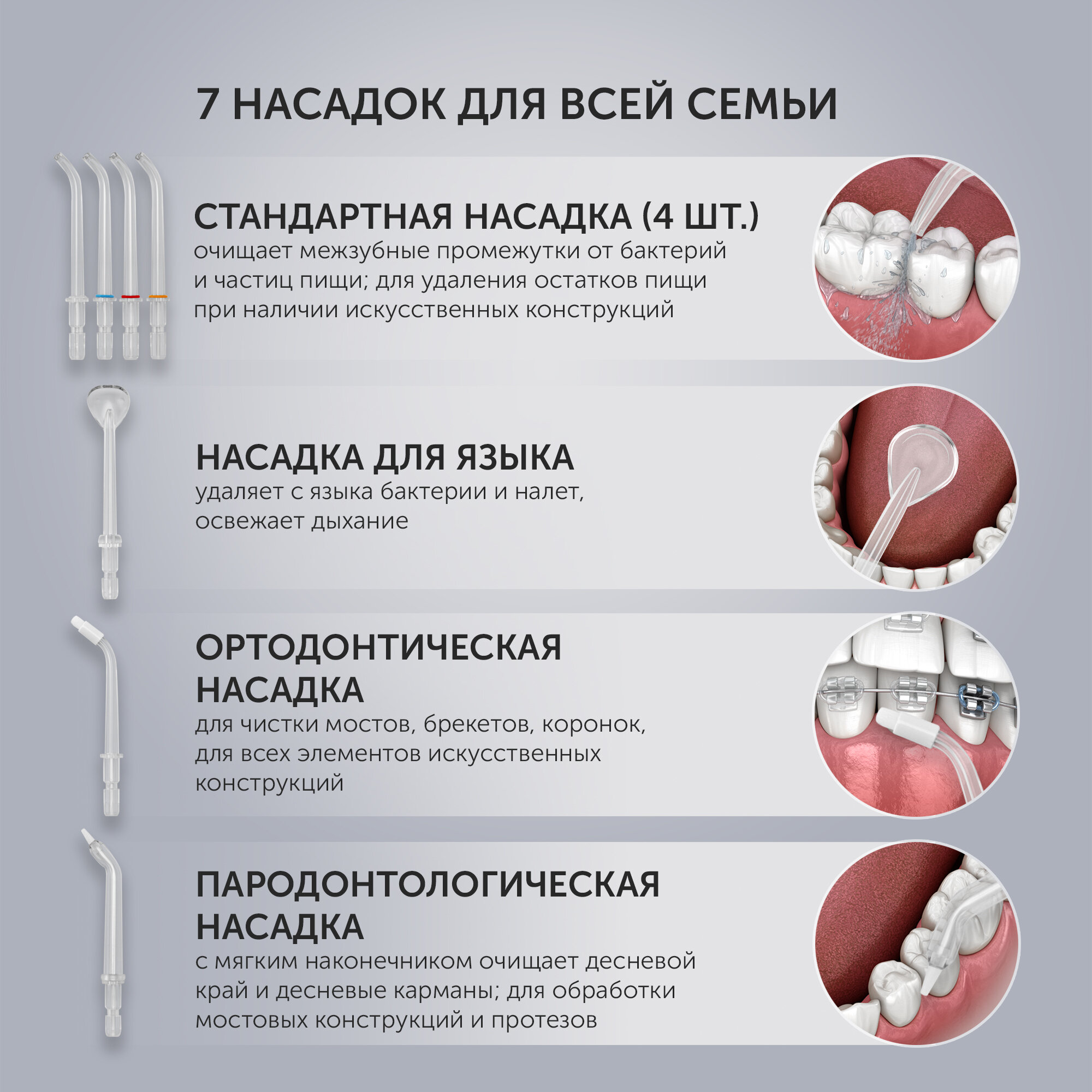 | Насадки | для струйной чистки / для чистки языка / ортодонтическая (для брекетов) / пародонтологическая (для десен) |