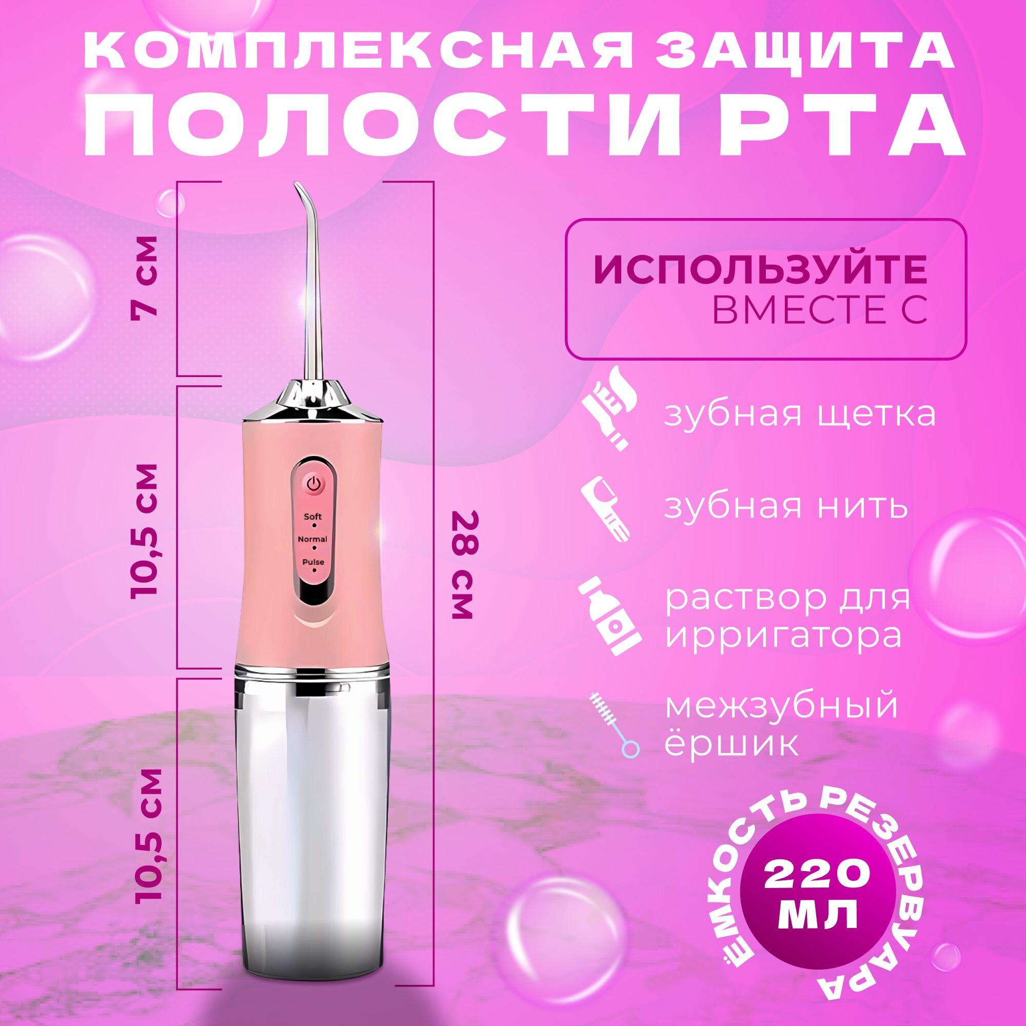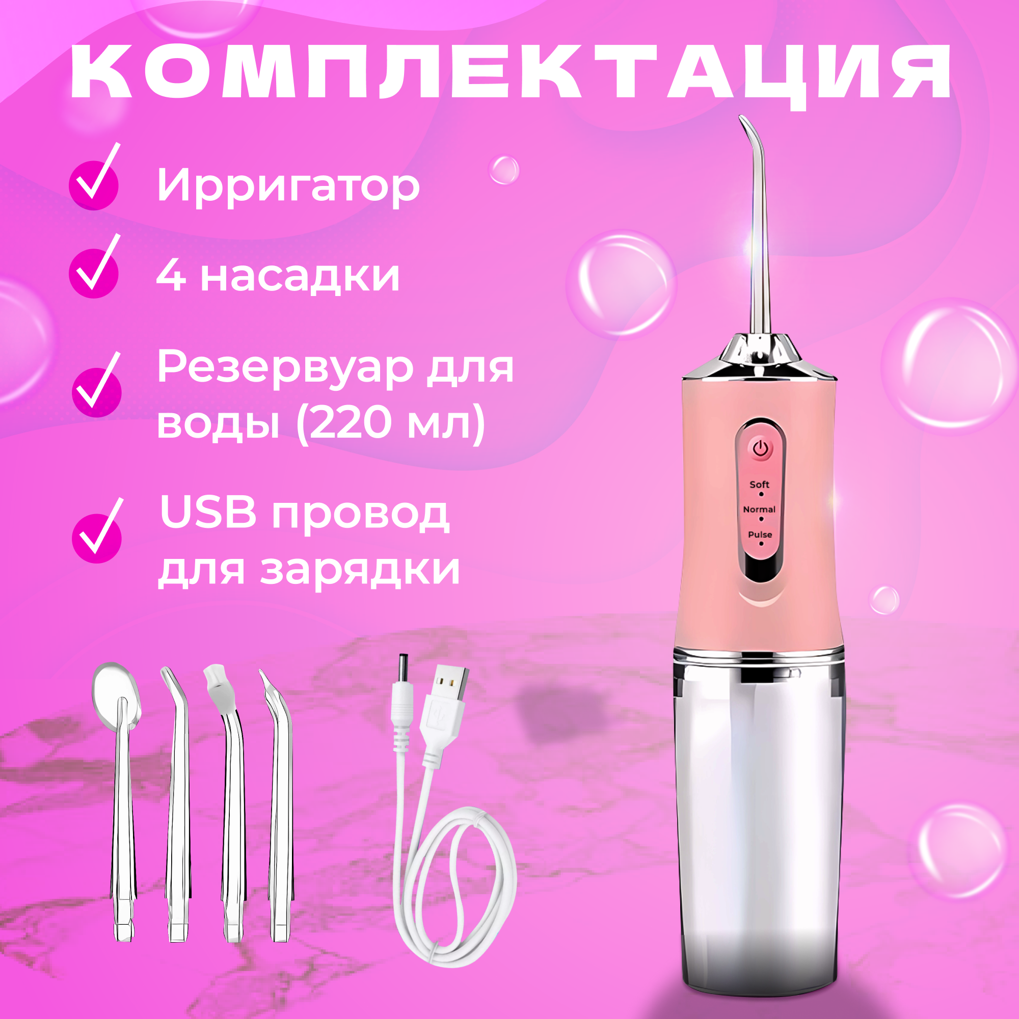 Ирригатор для зубов и полости рта портативный, розовый цвет, 4 насадки и 3 режима информация: