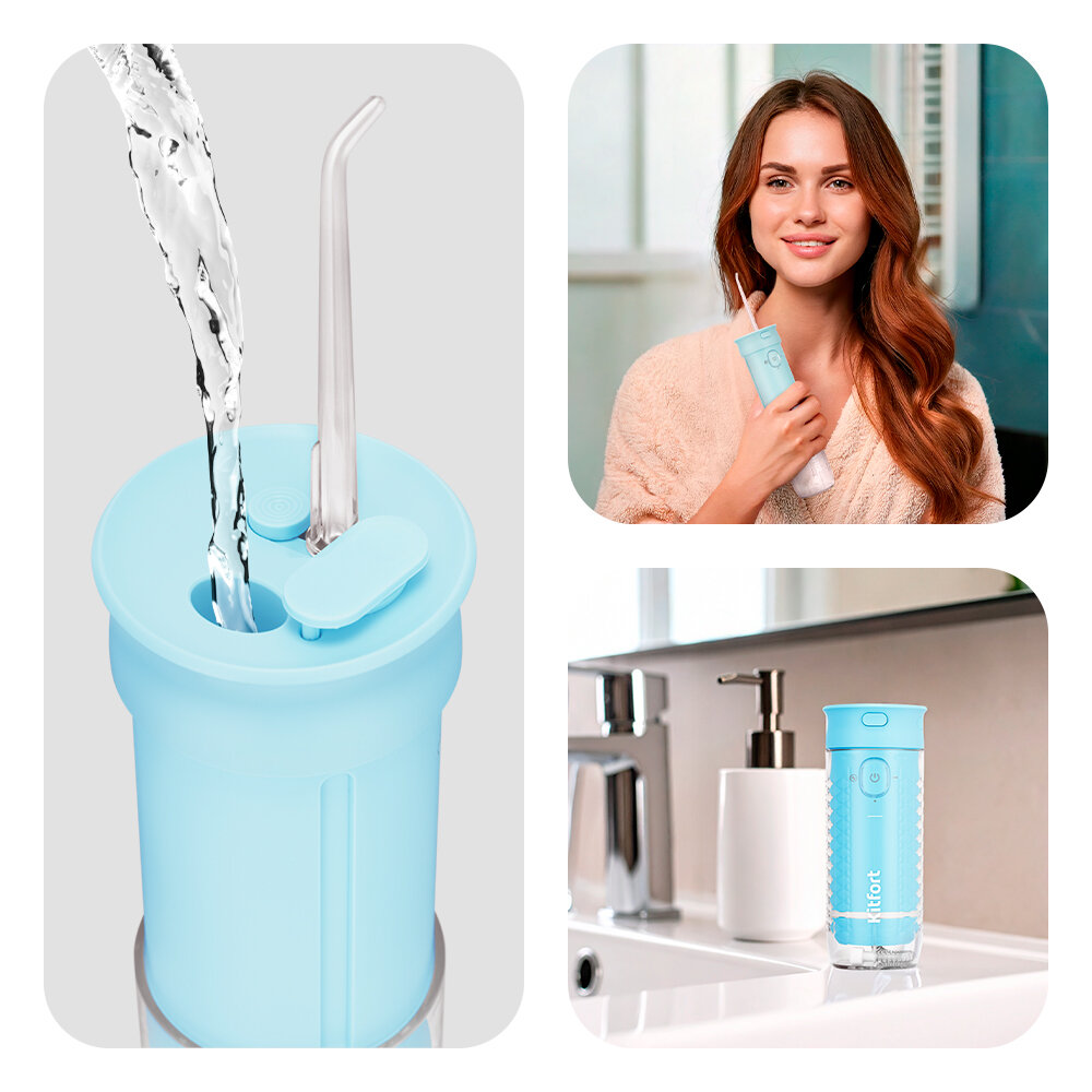 Ирригатор для полости рта. Портативный ирригатор. Ирригатор со сменными 4 насадками голубой