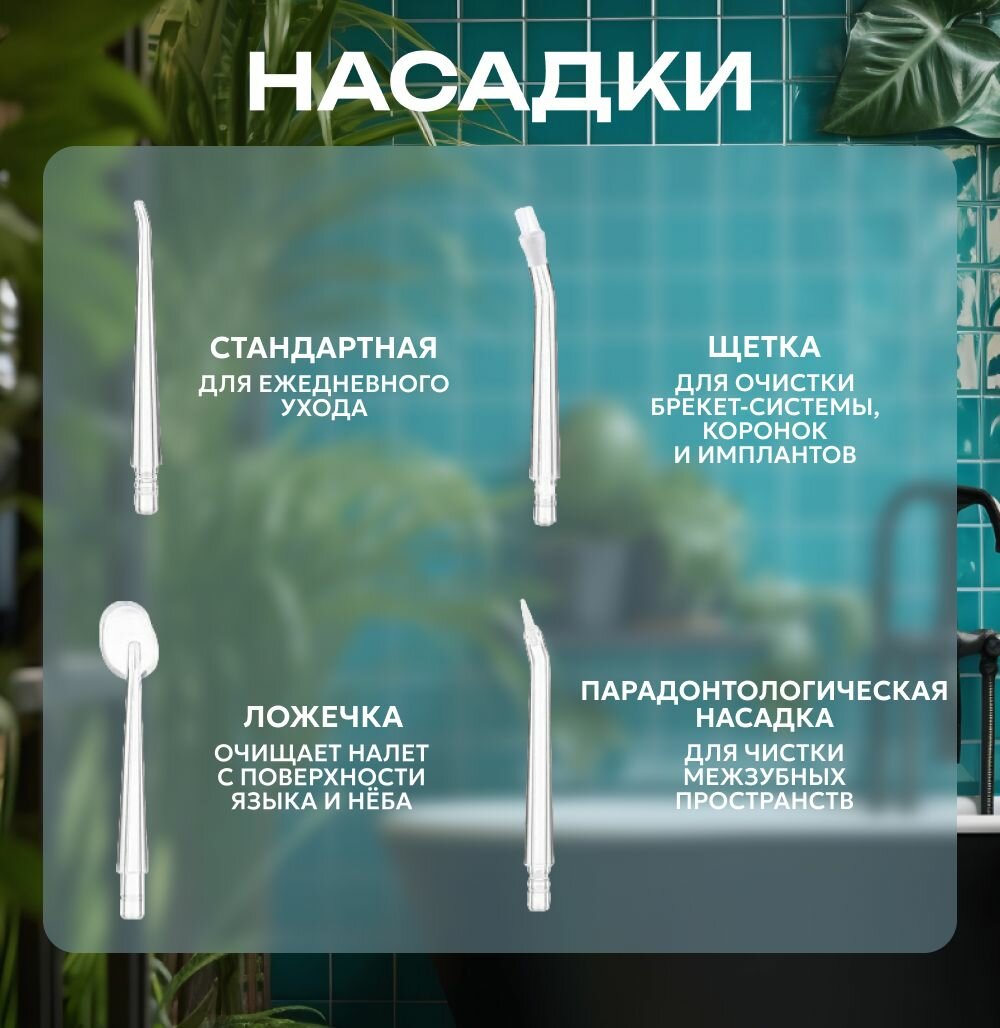 Насадки | для струйной чистки / для чистки языка / ортодонтическая (для брекетов) / пародонтологическая (для десен) / Для межзубных промежутков |