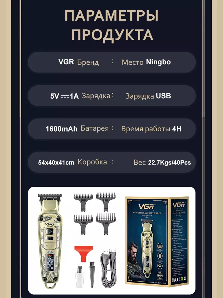 Машинка беспроводная для бороды и волос VGR V-901, 4 насадки информация: