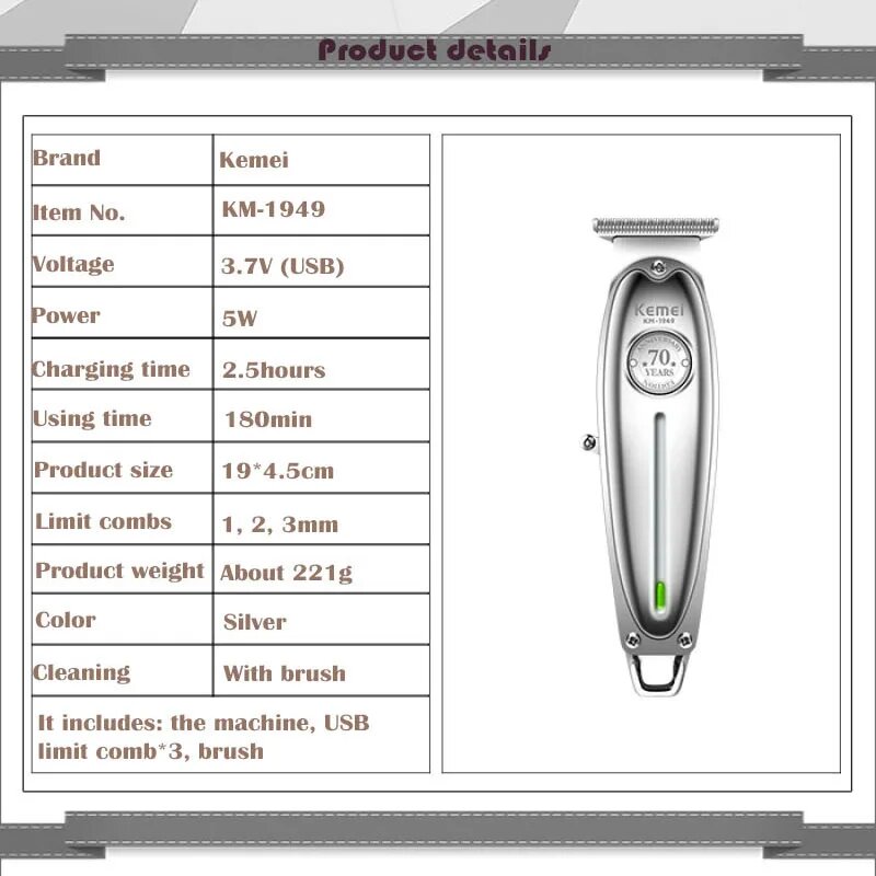 Полностью металлический аккумуляторный триммер Kemei KM-1949 (серебристы) информация: