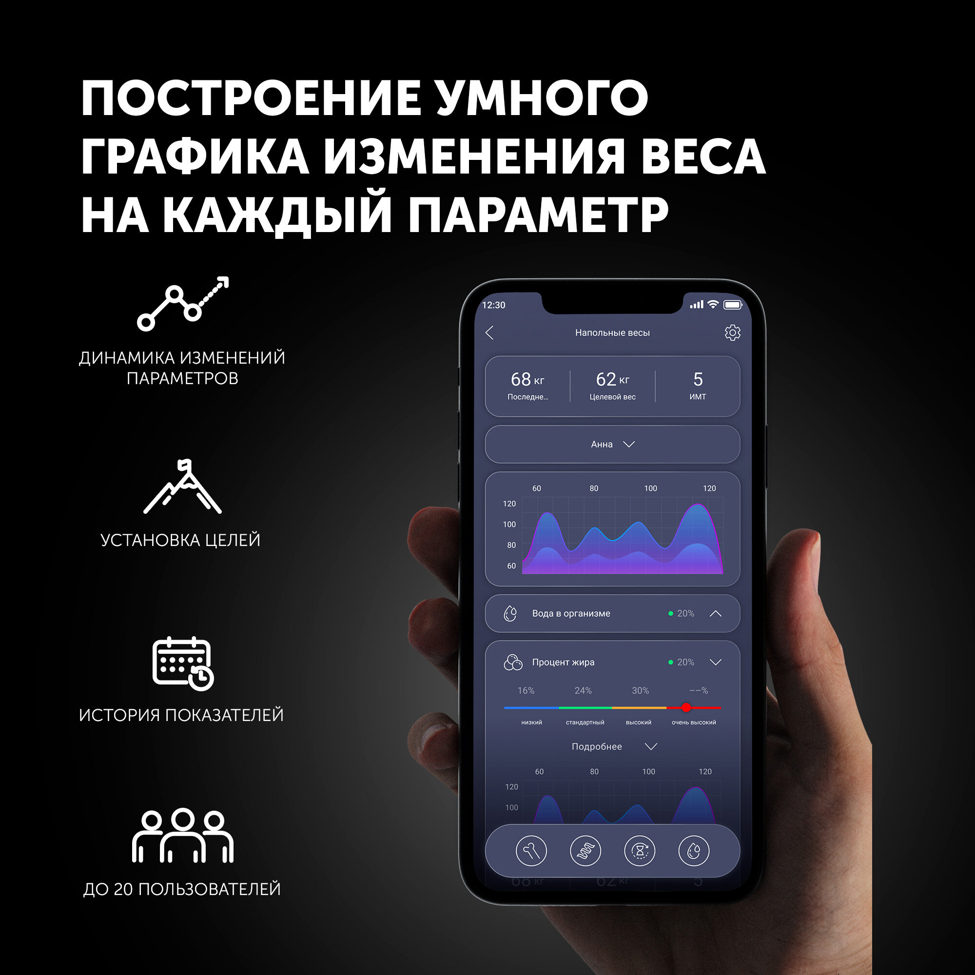 | Дополнительная информация | Вес, Индекс массы тела, Процент жира (жировая масса), Вода в организме (содержание воды), Висцеральный жир, Подкожный жир, Доля мышц в теле (мышечная масса), Базовый расход калорий (Основной обмен веществ), Мышечная масса, Костная масса, Масса тела без жира, Доля скелетных мышц (скелетные мышцы), Уровень белка (измерение белка), Биологический возраст |