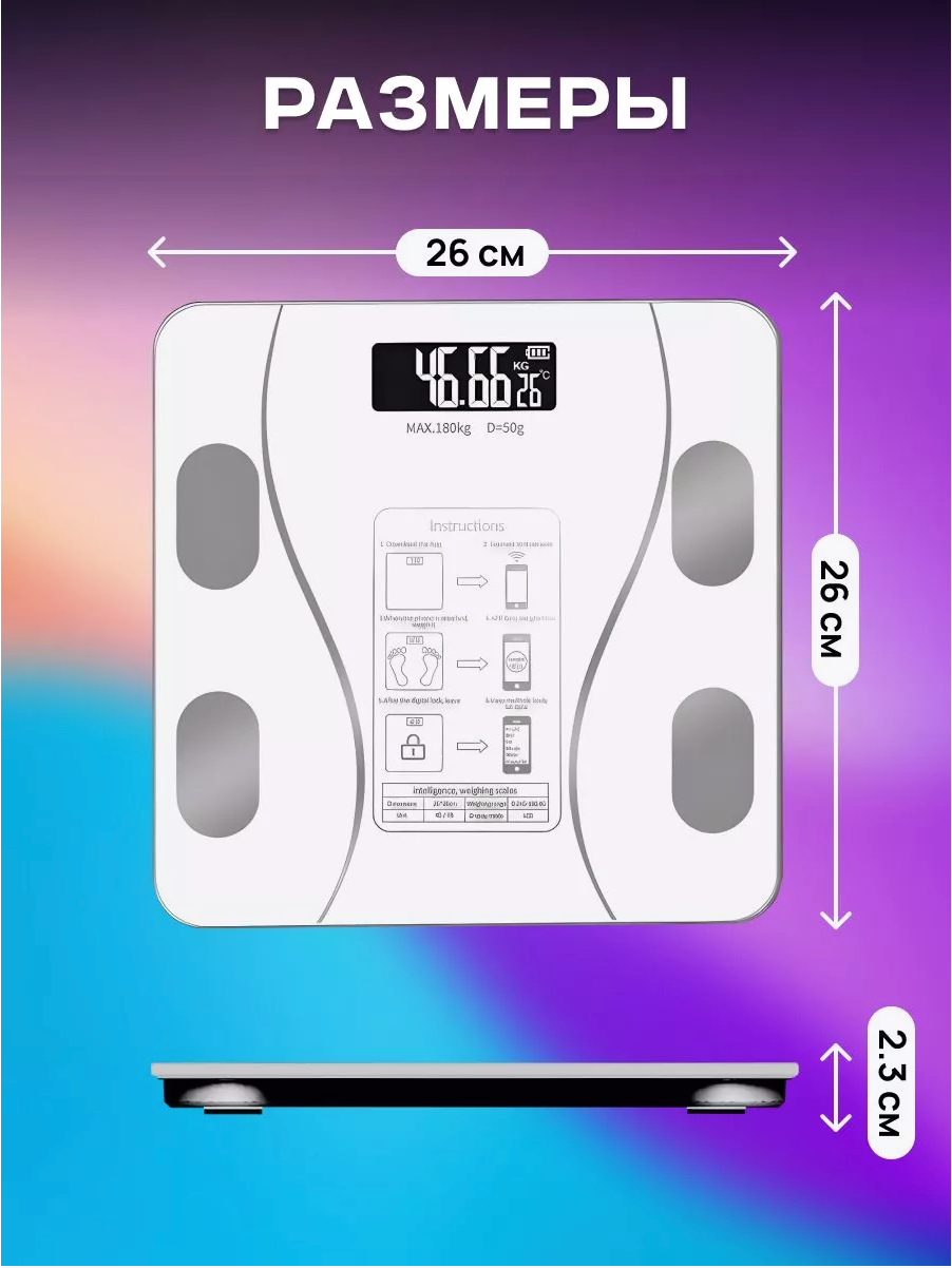 | Комплектация | Весы напольные электронные - 1шт; Кабель для зарядки USB - 1шт; Пошаговая инструкция - 1шт; Коробка - 1шт. |