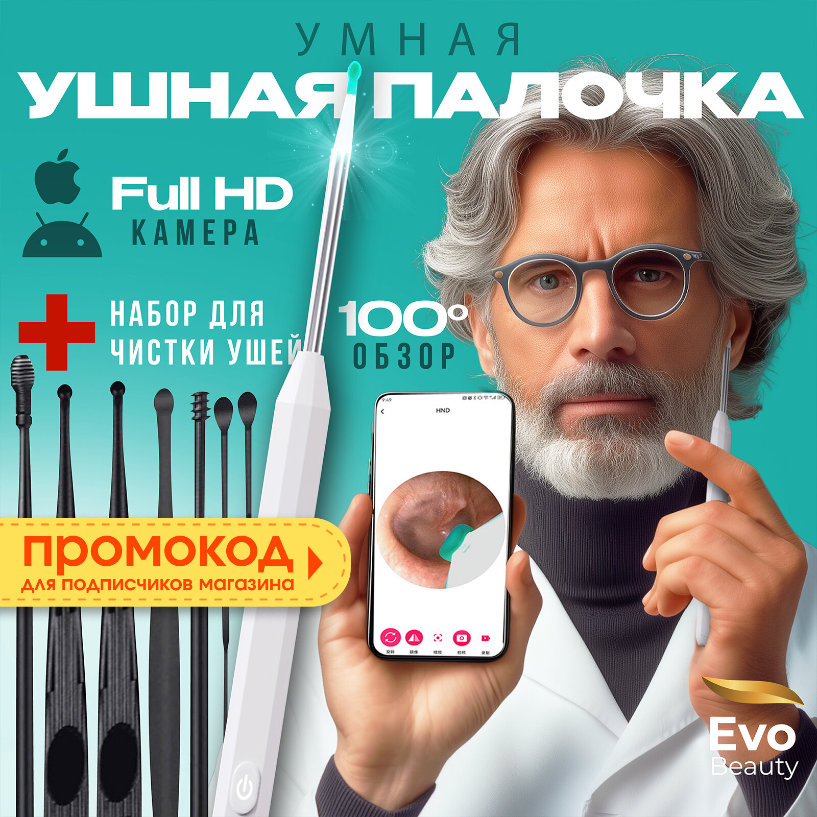 Отзывы на Умная палочка для чистки ушей с камерой Evo Beauty с силиконовыми насадками. Набор стальных палочек в подарок