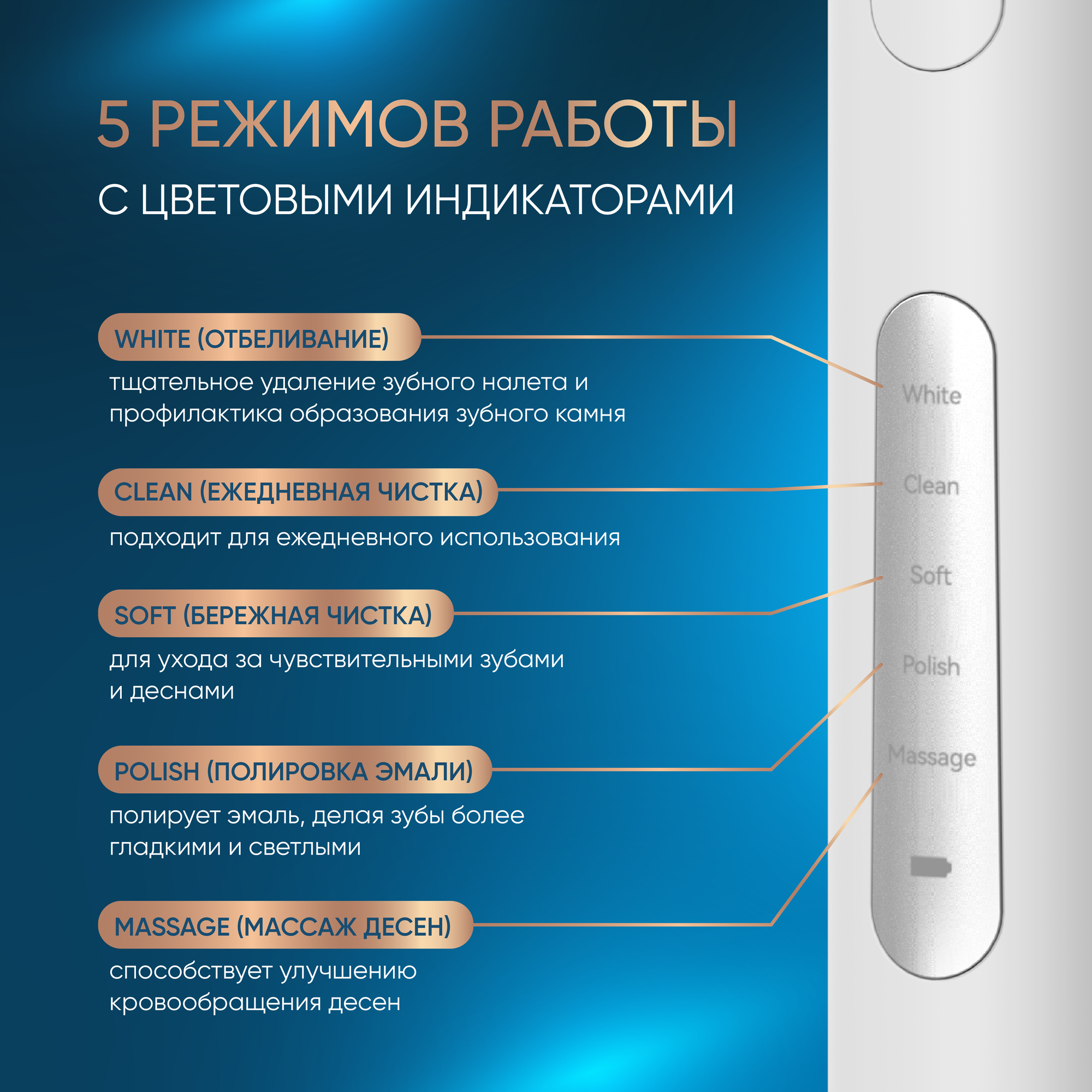 | Режимы работы | деликатная чистка / ежедневная чистка / массаж / отбеливание / полировка |