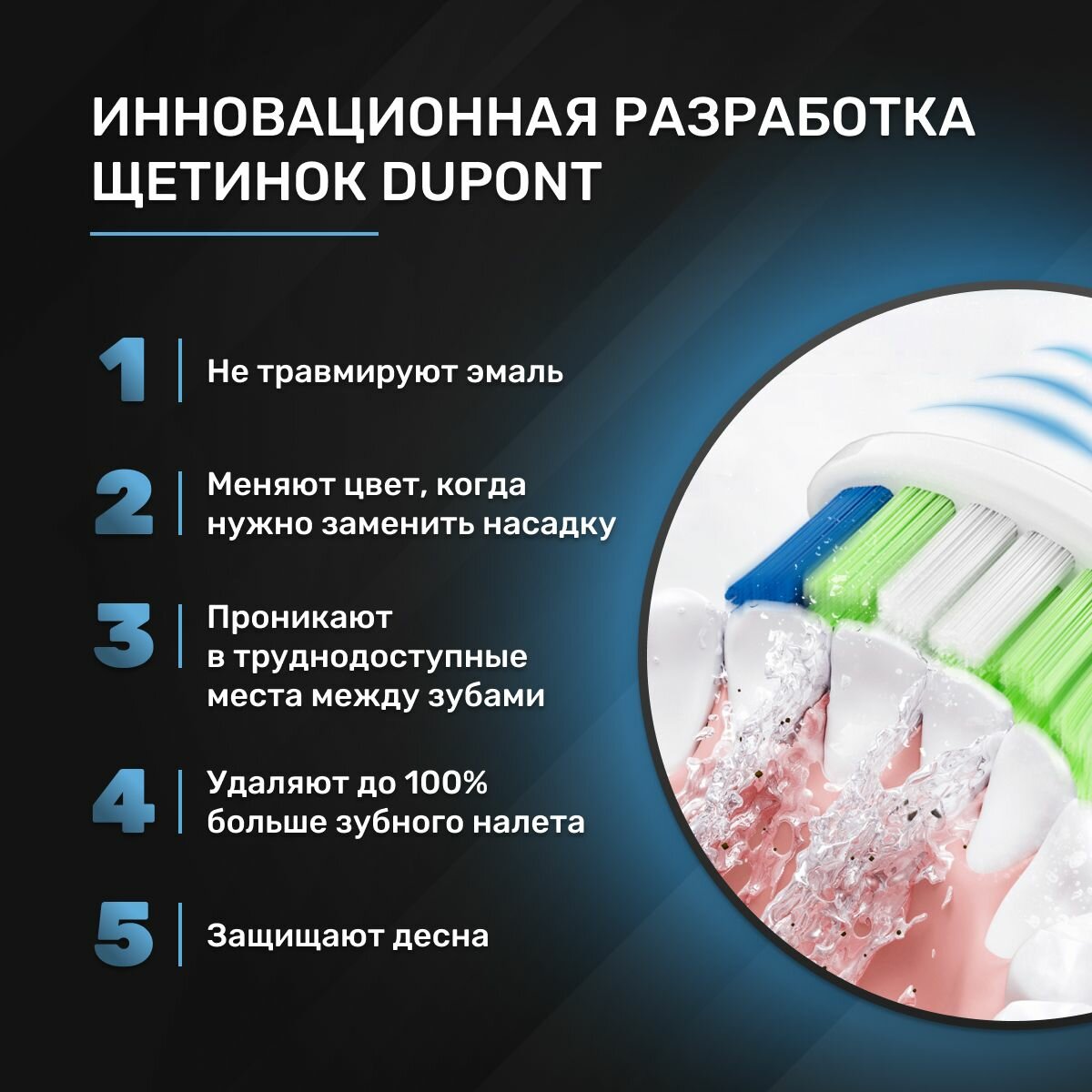 | Подробная комплектация | Электрическая зубная щетка, 6 сменных насадок, кейс для хранения, док-станция для зарядки, инструкция по использованию |