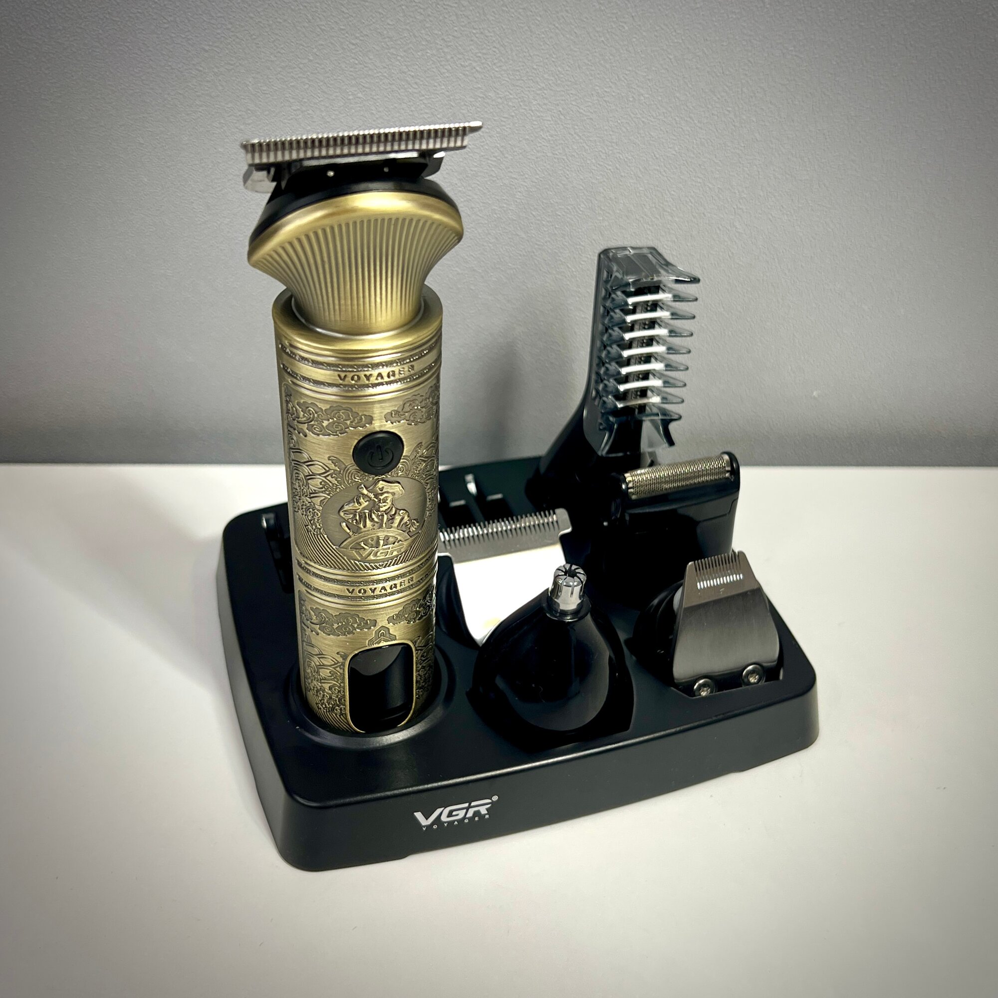 | Подробная комплектация | 1. Машинка для стрижки/ Триммер для волос VGR V-106 2. Режущие направляющие гребенки (1/3/5/7 мм) 3. Направляющие для стрижки волос (3/6/9/12/15 мм) 4. Насадка для тела. 5. Машинка для стрижки волос/ Шейвер 6. Дизайнерский триммер 7. Бритвенная насадка 8. Триммер для носа и ушей. 9. Масло 10. Щетка для чистки. 11. USB-кабель для зарядки. 12. Дорожный чехол |
