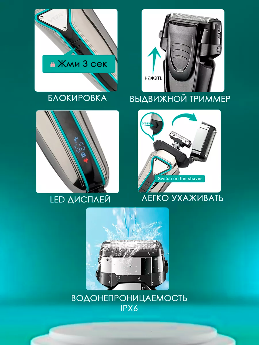 | Особенности | быстрая зарядка / дисплей / для чувствительной кожи / питание от USB / триммер |