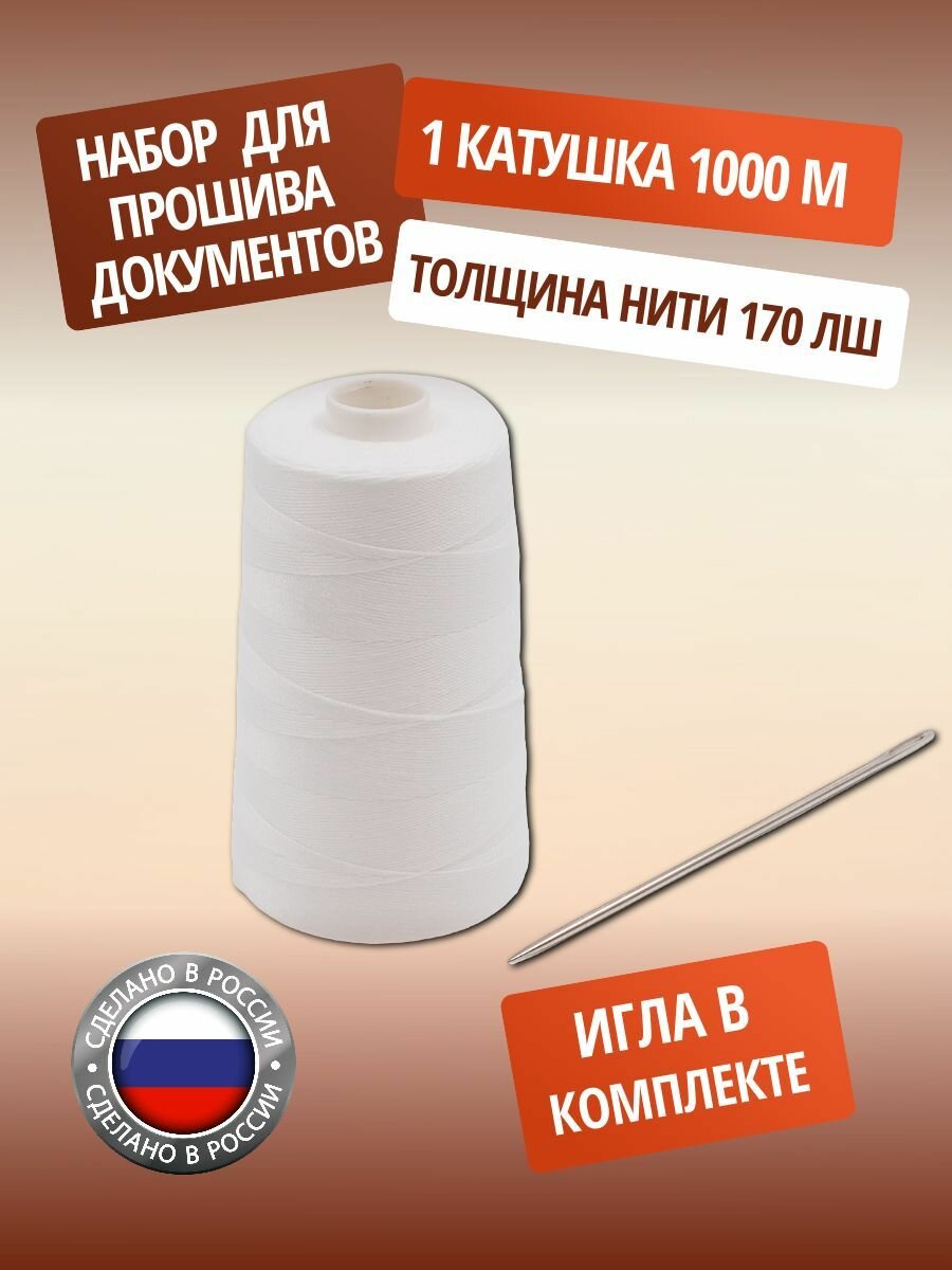 Набор нитка 170ЛШ 1000м 'Для прошива документов' 1 шт белые, игла информация: