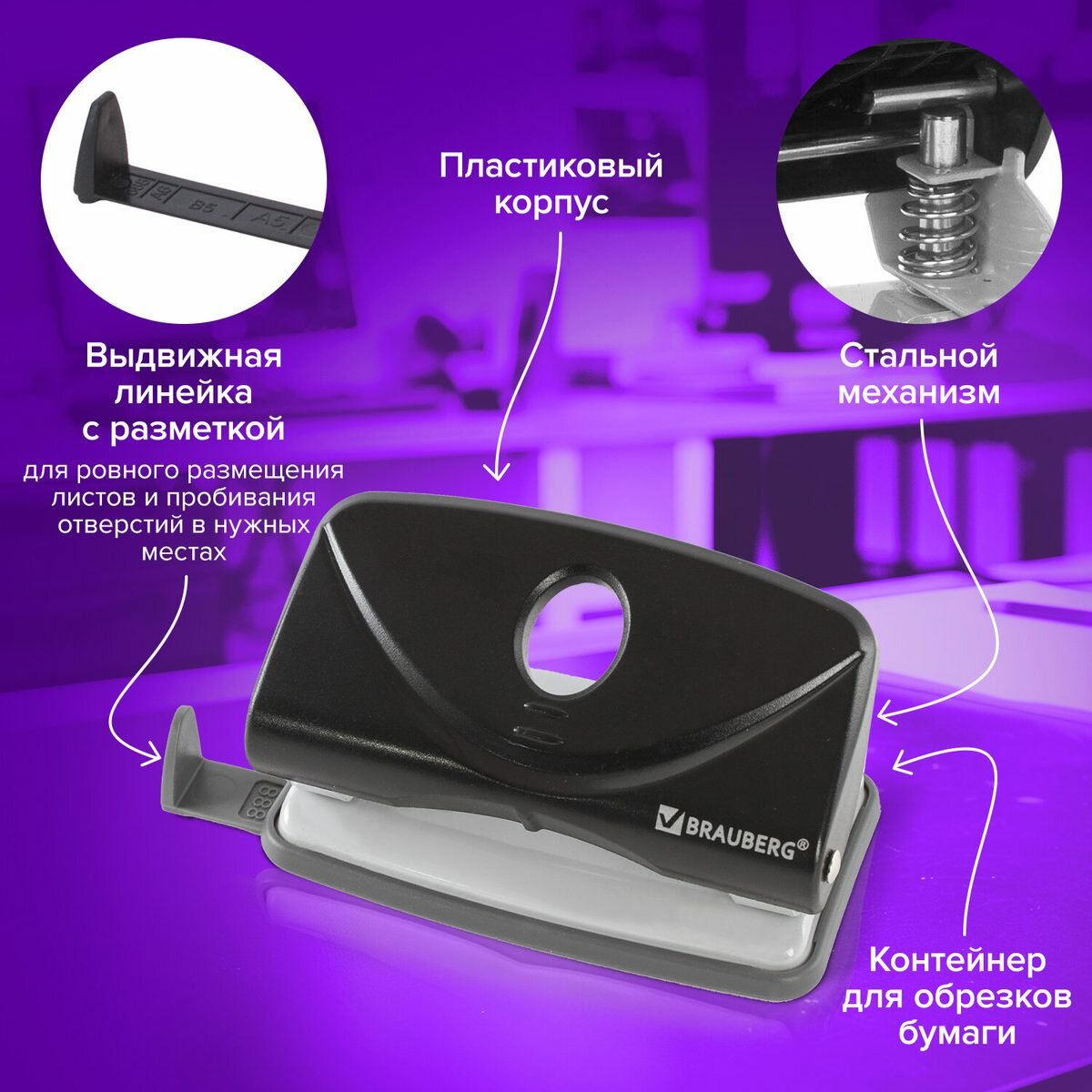 Дырокол для бумаги канцелярский с линейкой А4 до 20 листов, черный, Brauberg Super, 272742