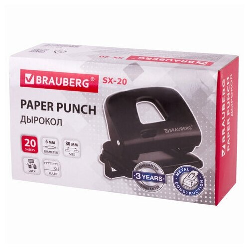 Дырокол для бумаги канцелярский с линейкой А4 до 20 листов, черный, Brauberg Super, 272742