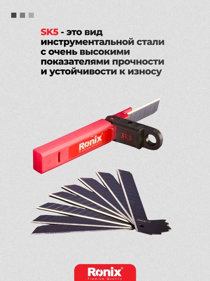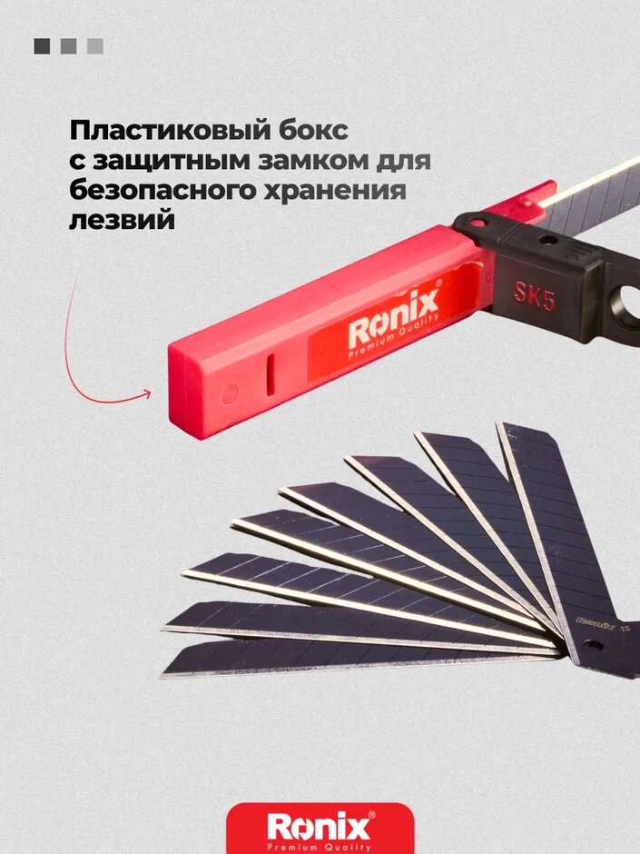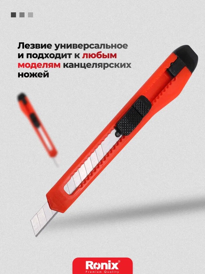 Лезвия 9 мм для канцелярского ножа Ronix 10 штук, японская сталь Sk5 в кейсе информация: