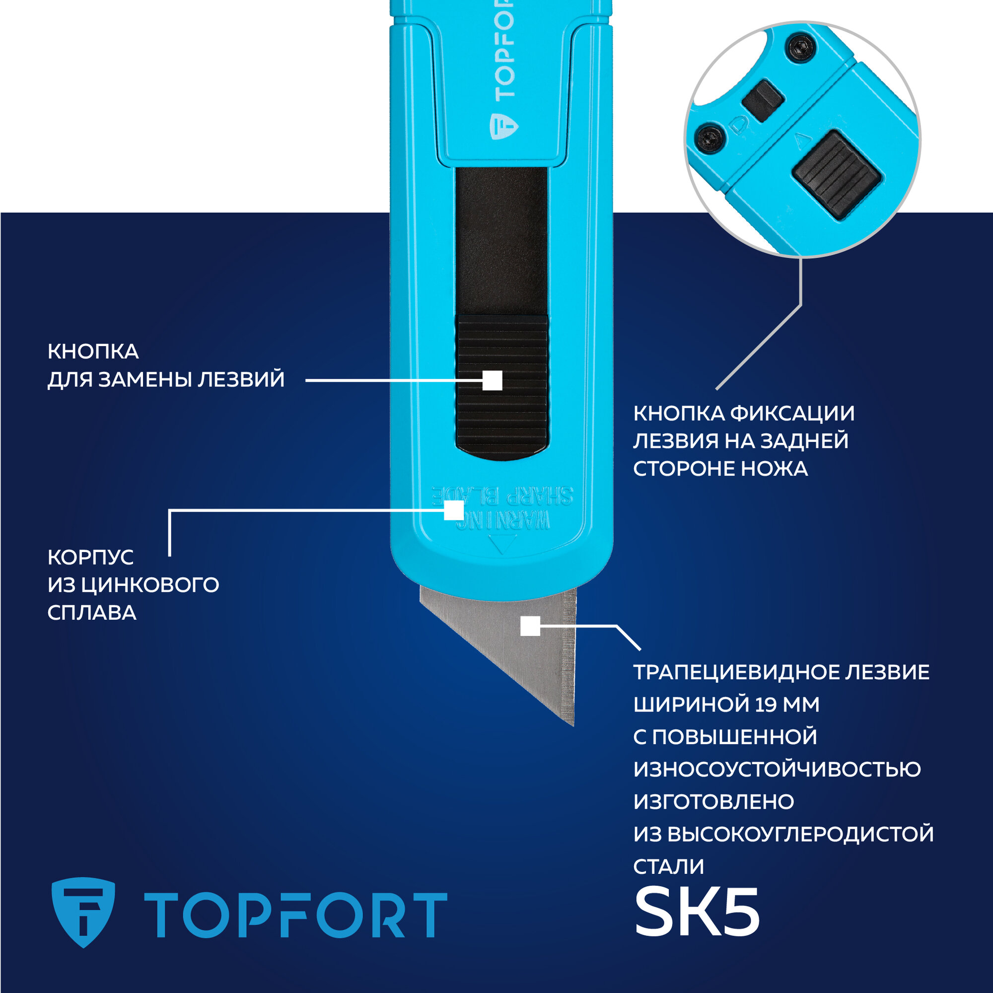 Нож безопасный, TOPFORT, мини, ширина лезвия 19 мм, с фиксатором