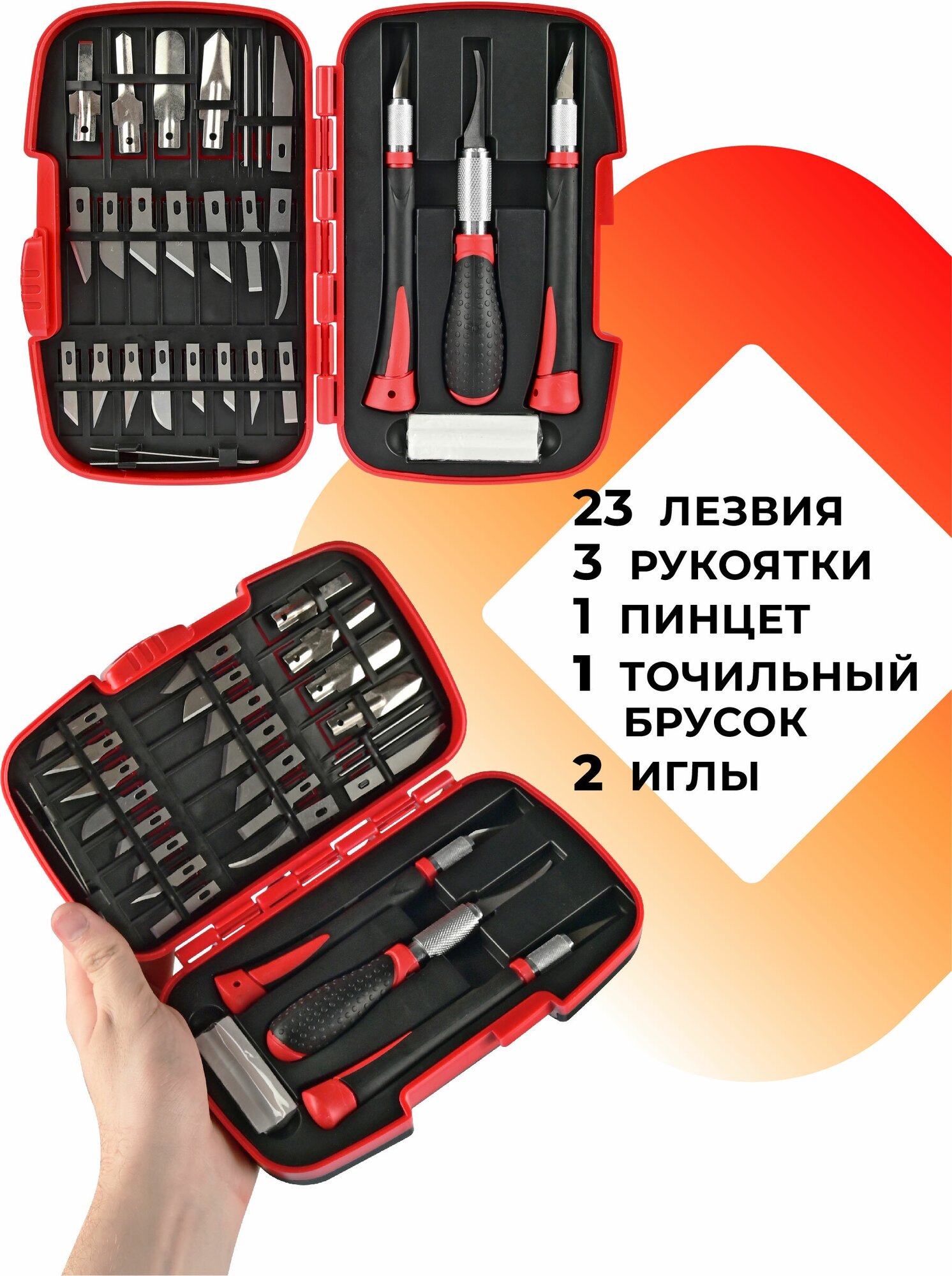 | Подробная комплектация | Сменные лезвия для ножа - 23 шт.; рукоятки для ножа - 3 шт.; пинцет - 1 шт.; иглы - 2 шт.; точильный брусок - 1 шт |
