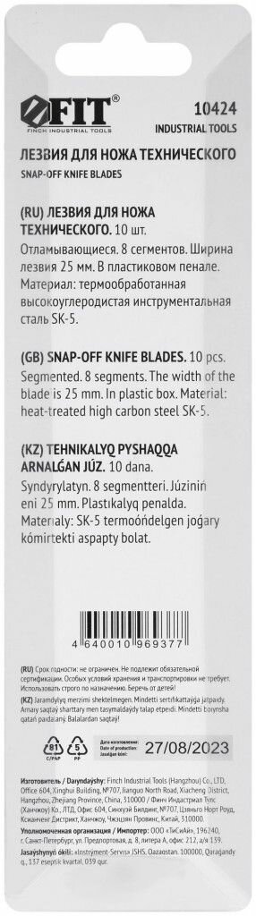FIT Лезвия сменные сегментированные 25 мм для ножа строительного канцелярского, сталь SK5, набор 10 шт. информация: