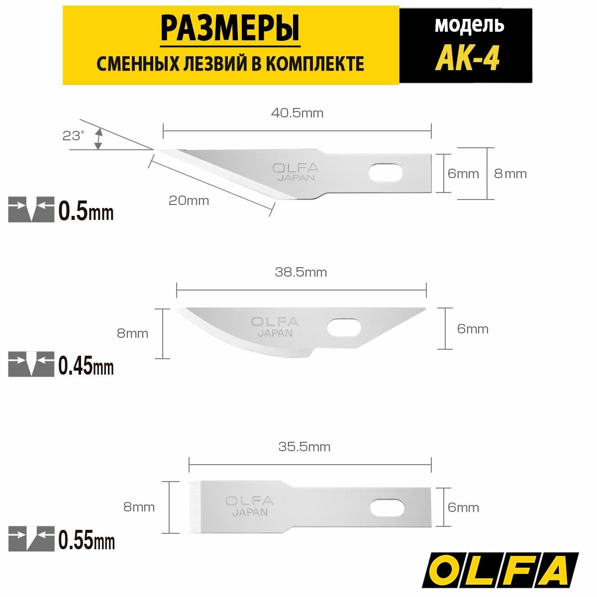 Нож художественный OLFA AK-4 6 мм, 4 сменных профильных лезвия, макетный скальпель канцелярский информация: