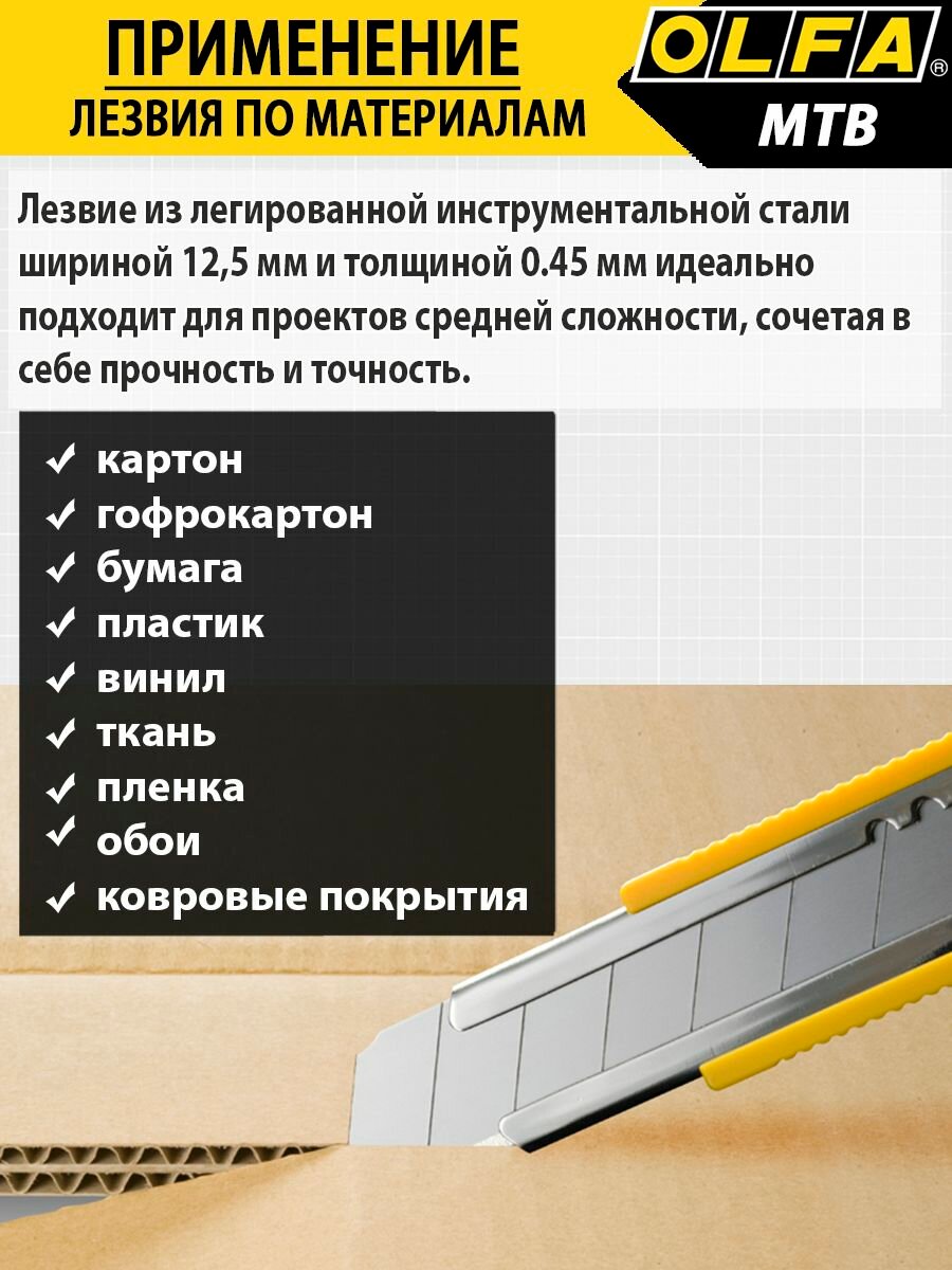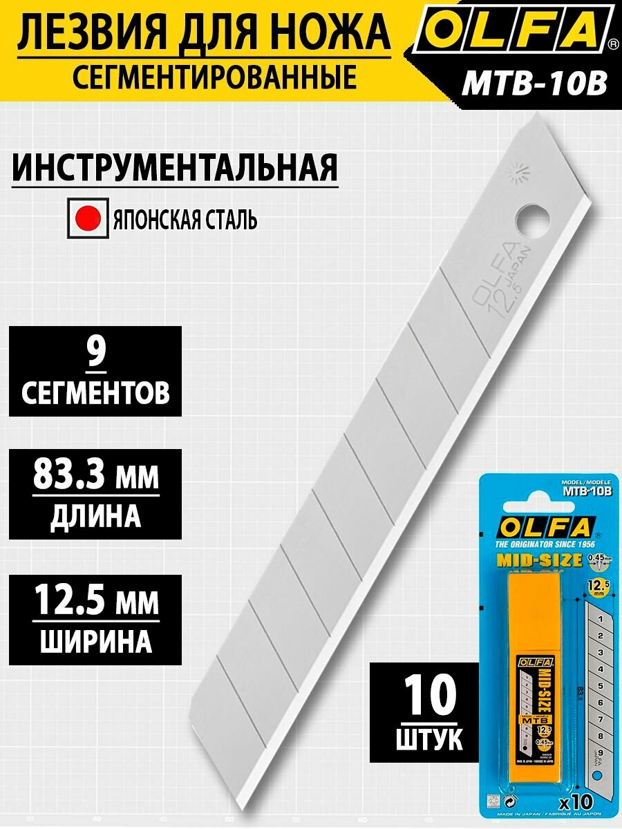 Лезвия OLFA MTB-10B для ножей XMT-1 и MT-1 12.5 мм, 10 штук в блистере, сегментированные, инструментальная сталь информация: