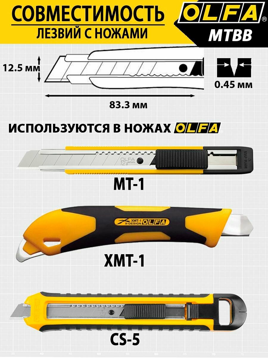 Лезвия OLFA MTBB-10B EXCEL BLACK для ножей XMT-1 и MT-1 12.5 мм, 10 штук в блистере, сегментированные информация: