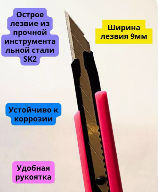 | Особенности | блокировка лезвия / отламывающееся лезвие / прорезиненная рукоятка / сменное лезвие |