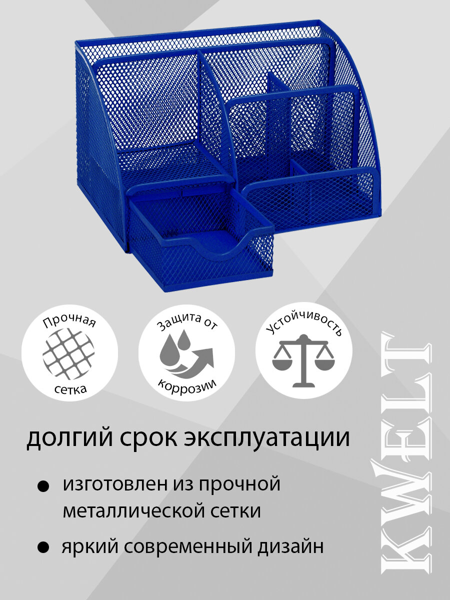 Отзывы на Подставка " KWELT " 7 отделений (1 выдвижное), металлическая, сетчатая, синяя, картонная упаковка 22*14*13см