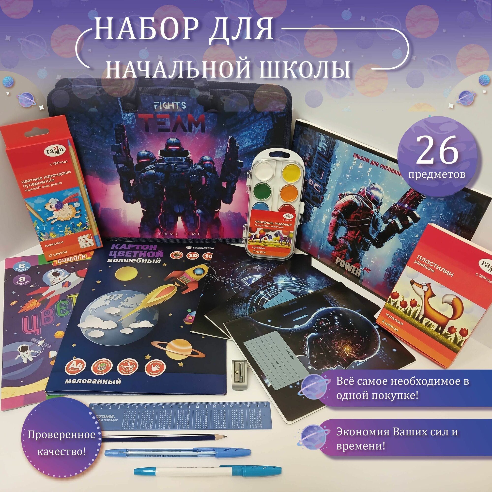 Отзывы на Набор для начальной школы, для мальчика 26 предметов "Кибервойны" в папке, набор школьных канцелярских принадлежностей