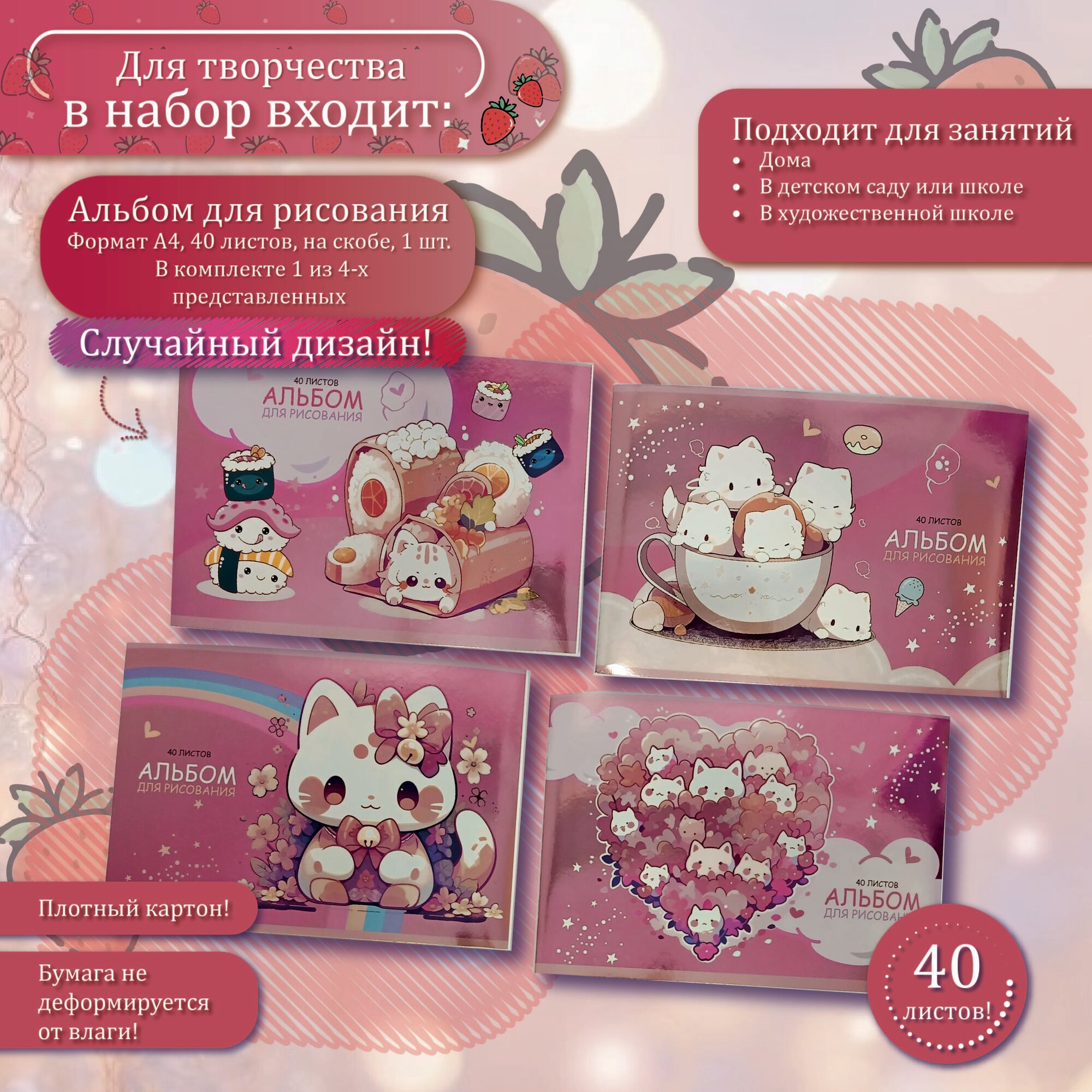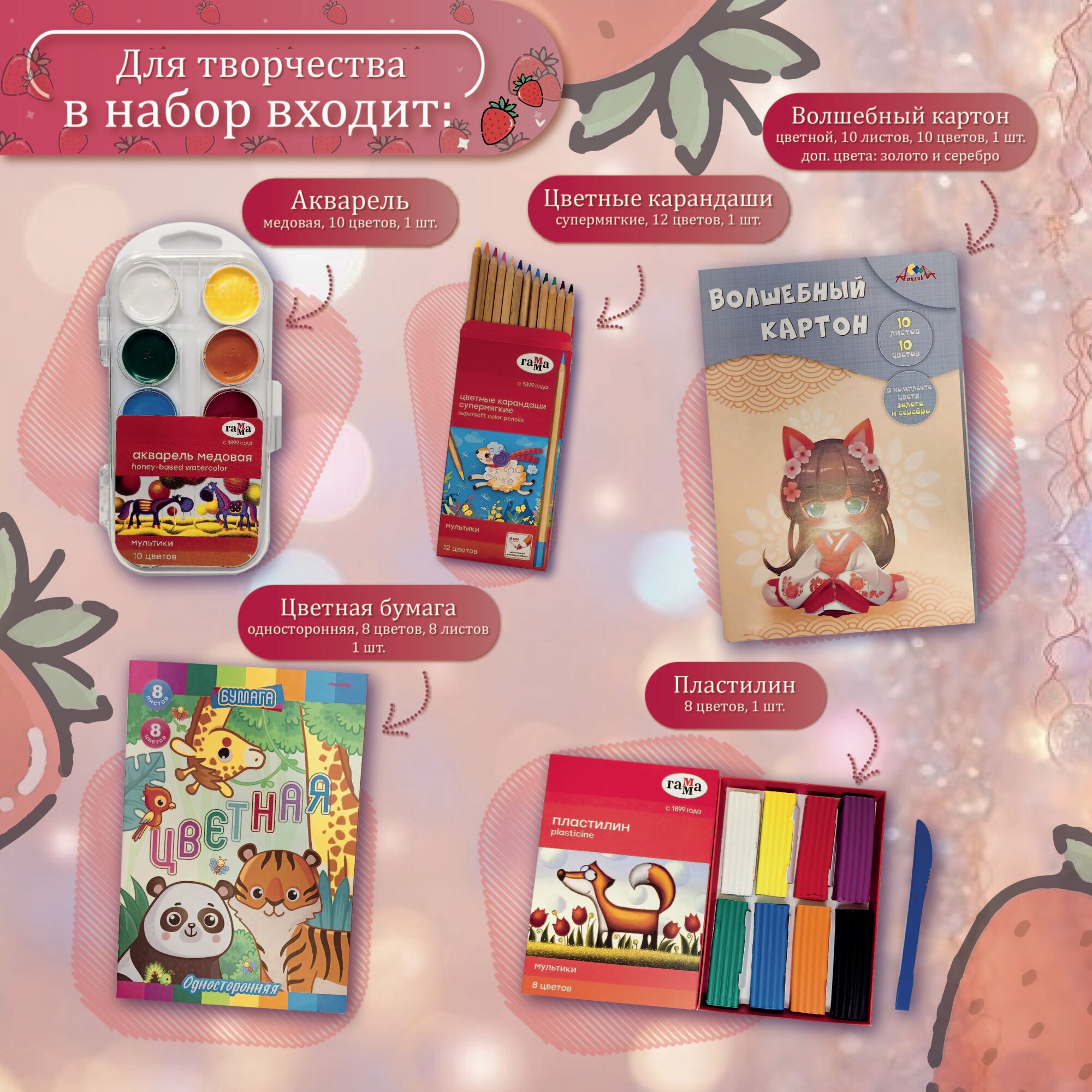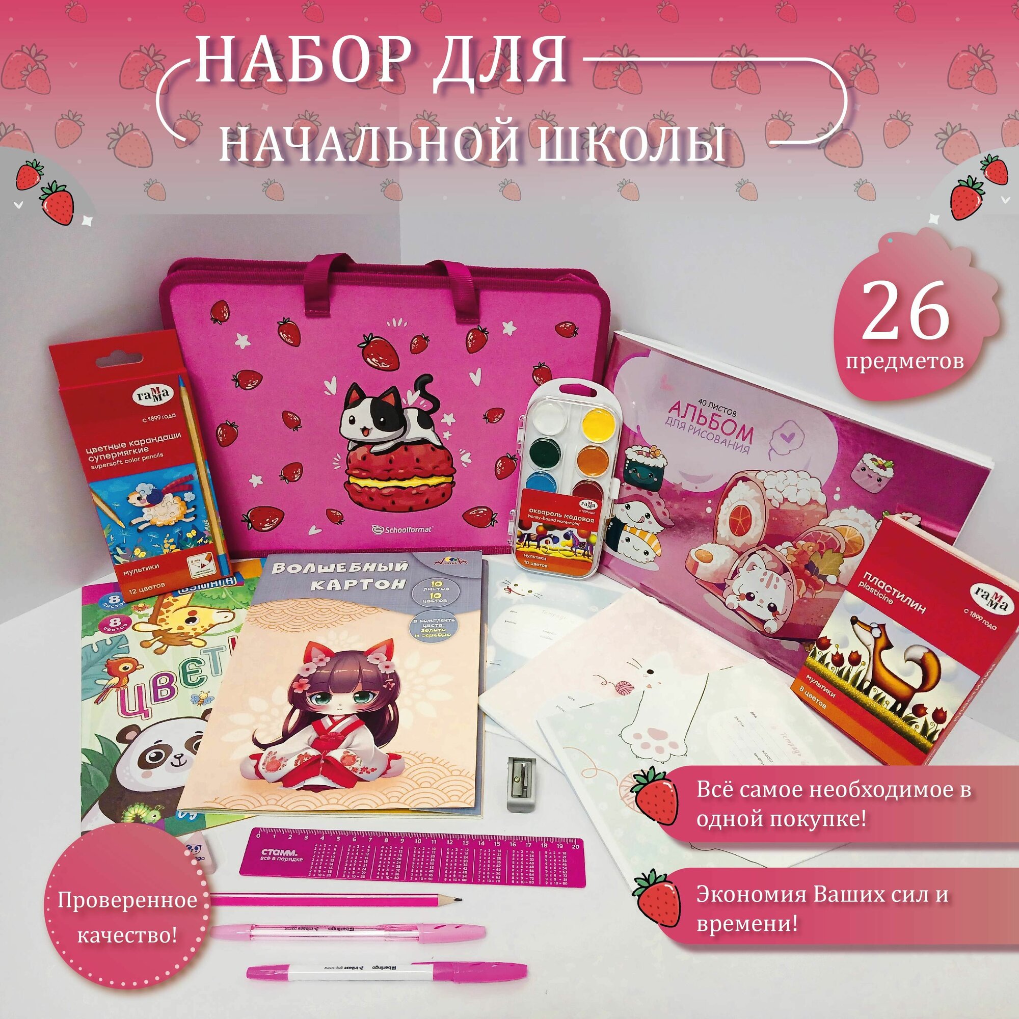 10 цен на Набор для начальной школы, для девочки 26 предметов "Котенок в клубнике" в папке, набор школьных канцелярских принадлежностей