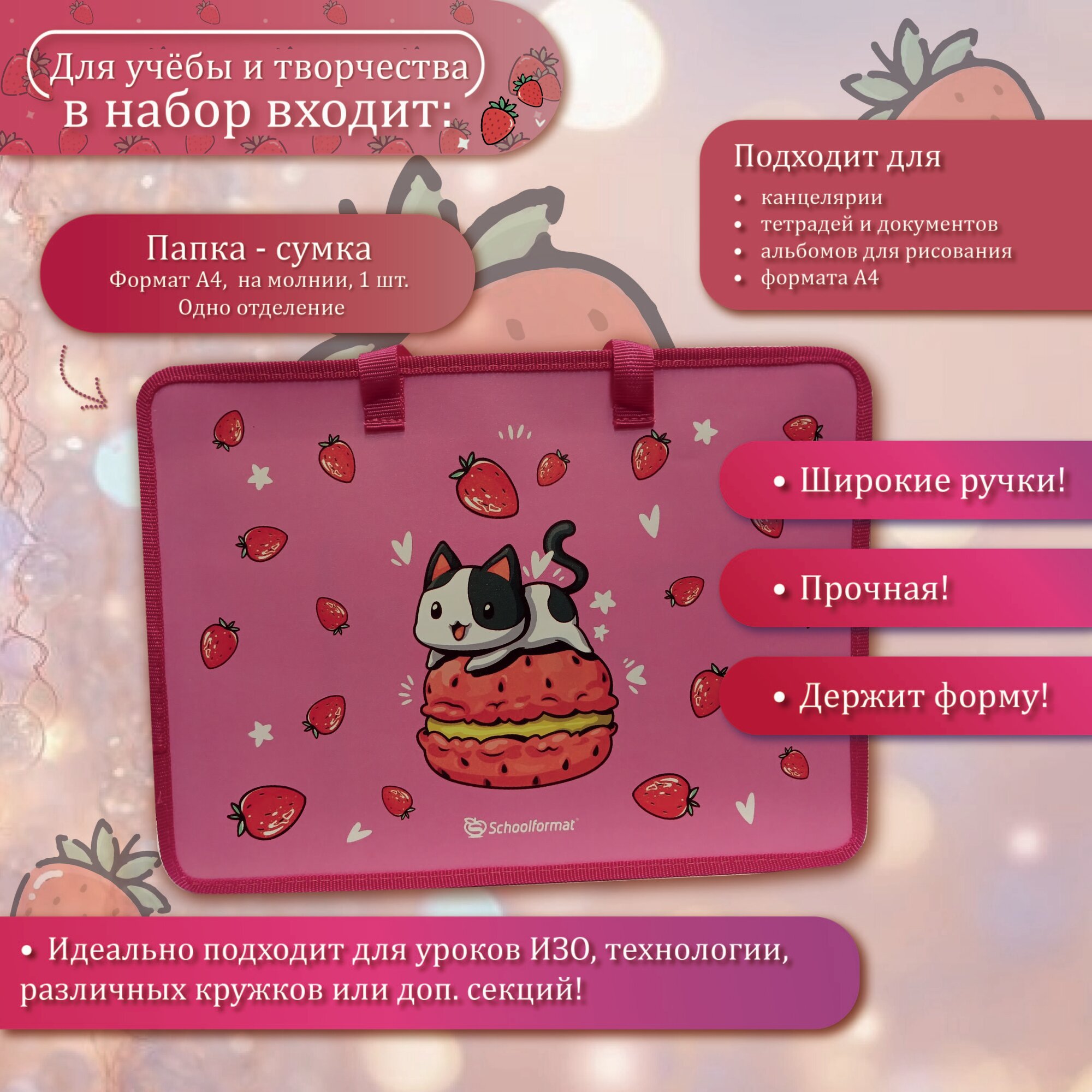 Набор для начальной школы, для девочки 26 предметов "Котенок в клубнике" в папке, набор школьных канцелярских принадлежностей информация: