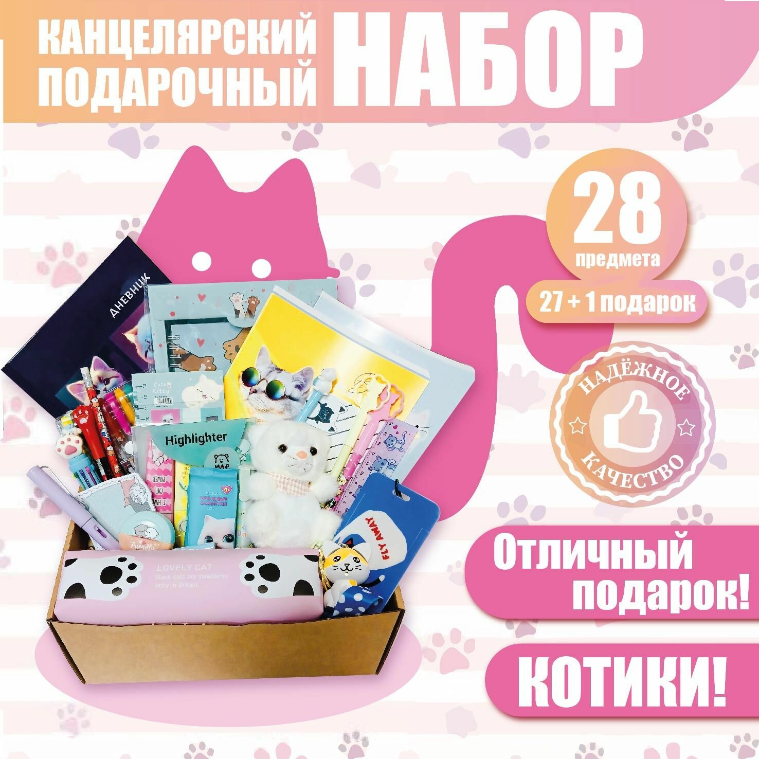 10 цен на Набор канцелярии "Мягкий подарочек!" 31+1 предметов, бокс письменных принадлежностей в подарочной коробке, канцелярский набор для школы (кошки)